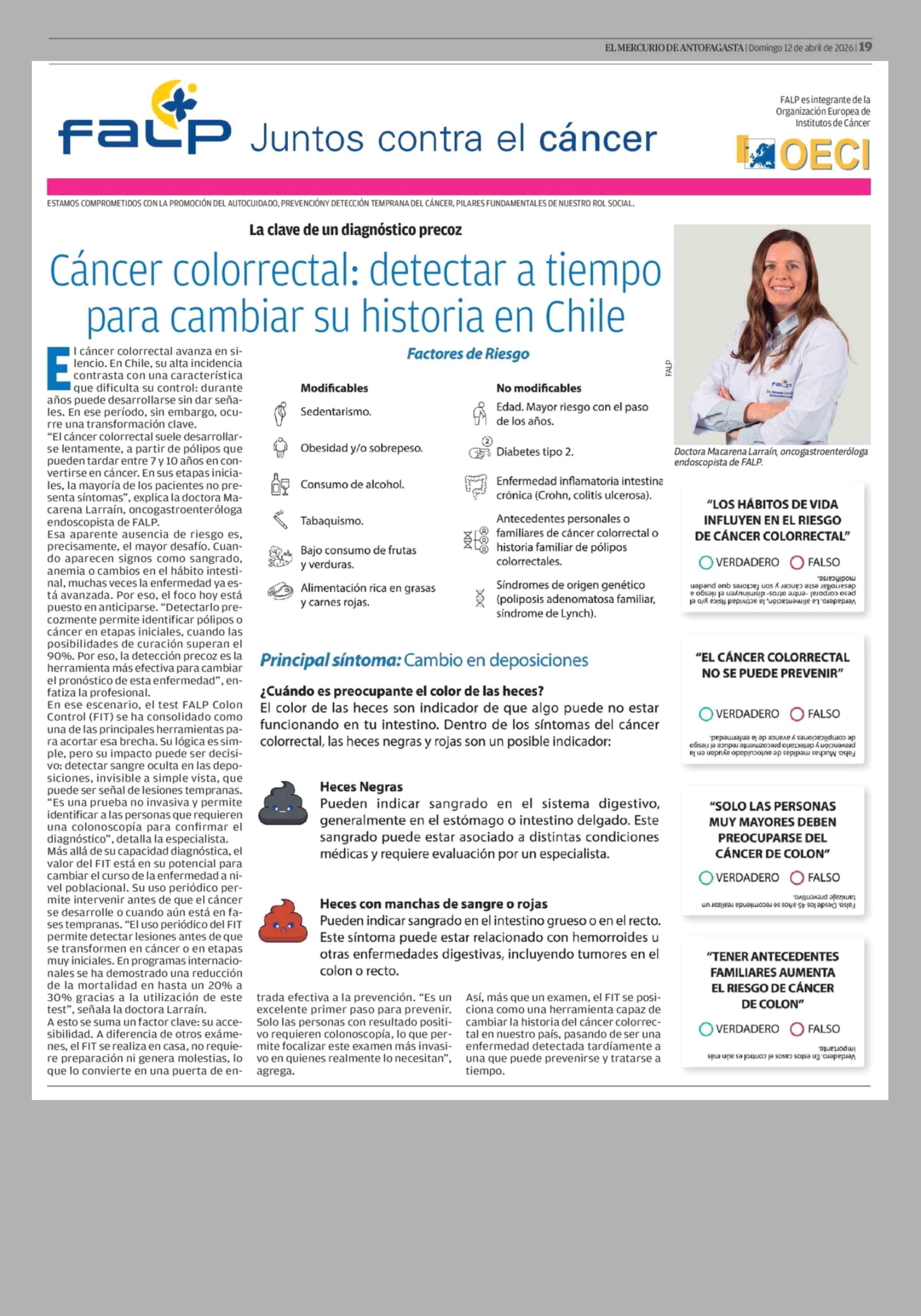 Cáncer colorrectal: detectar a tiempo para cambiar su historia en Chile 12-04-2026 El Mercurio de Antofagasta |