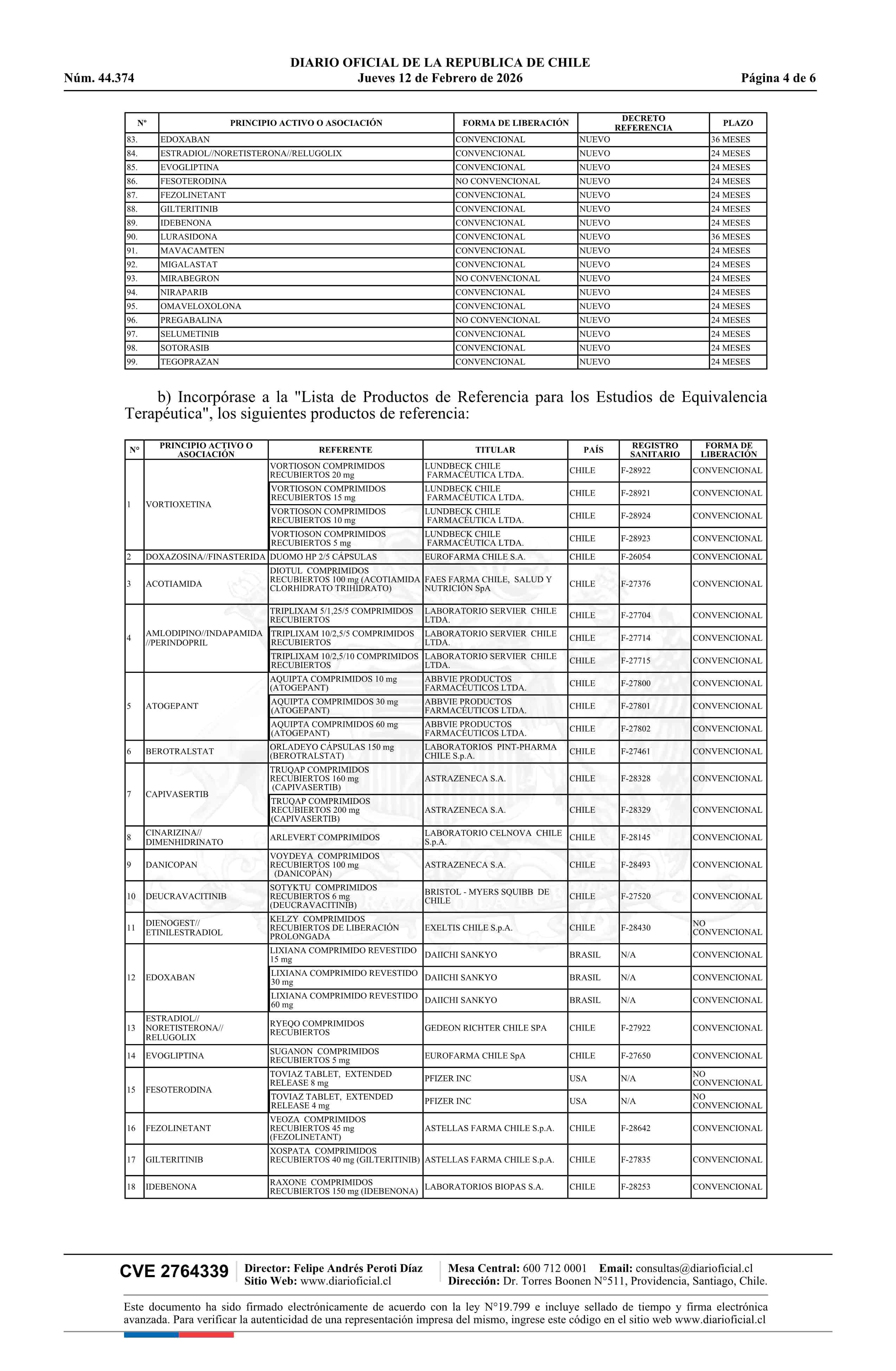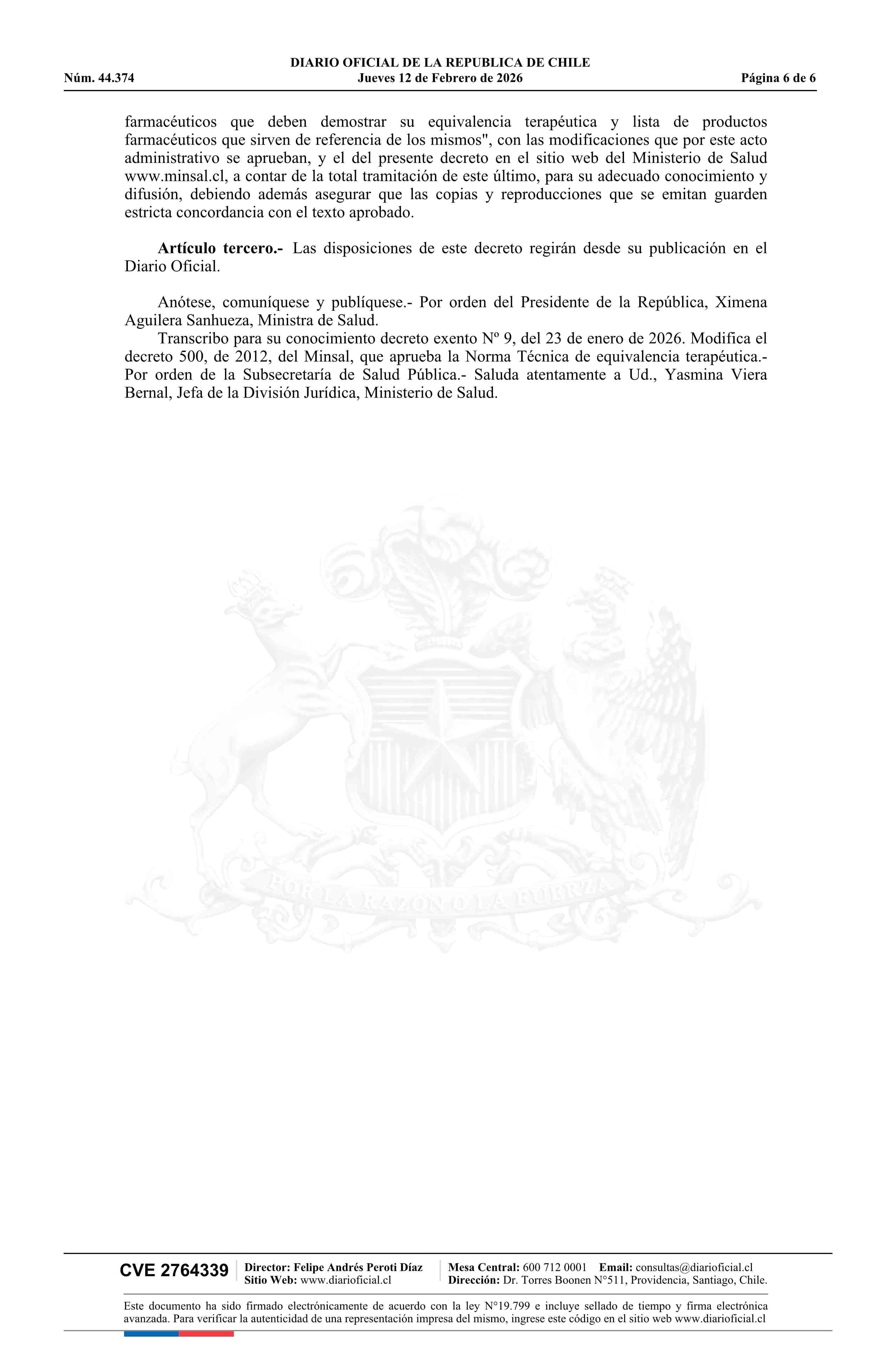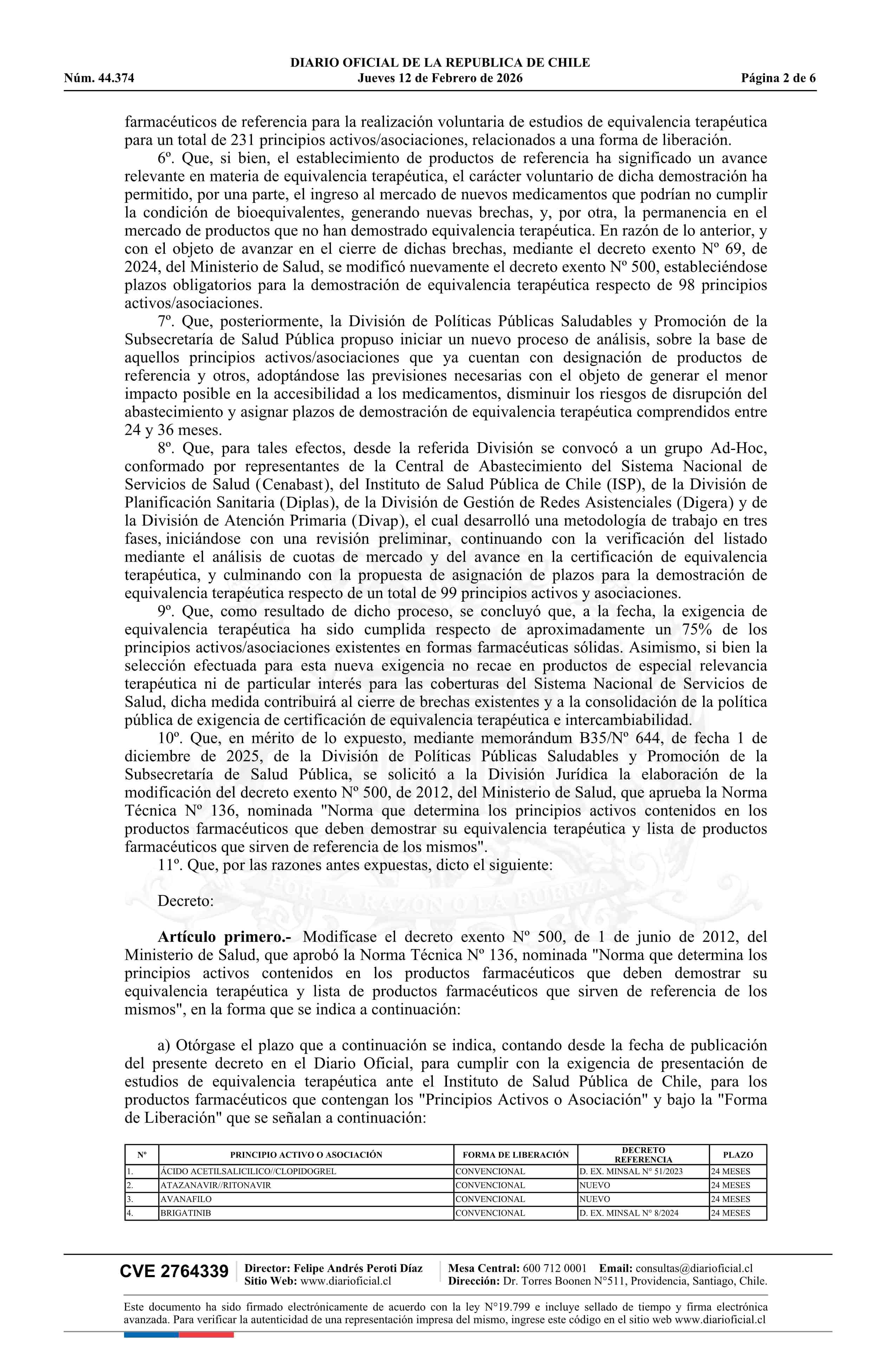 Título: Decreto exento número 9, de 2026.- Modifica decreto Nº 500, de 2012, que aprueba la Norma Técnica Nº 136, nominada Norma que determina los principios activos contenidos en los productos farmacéuticos que deben demostrar su equivalencia terapéutica y lista de productos farmacéuticos que sirven de ref