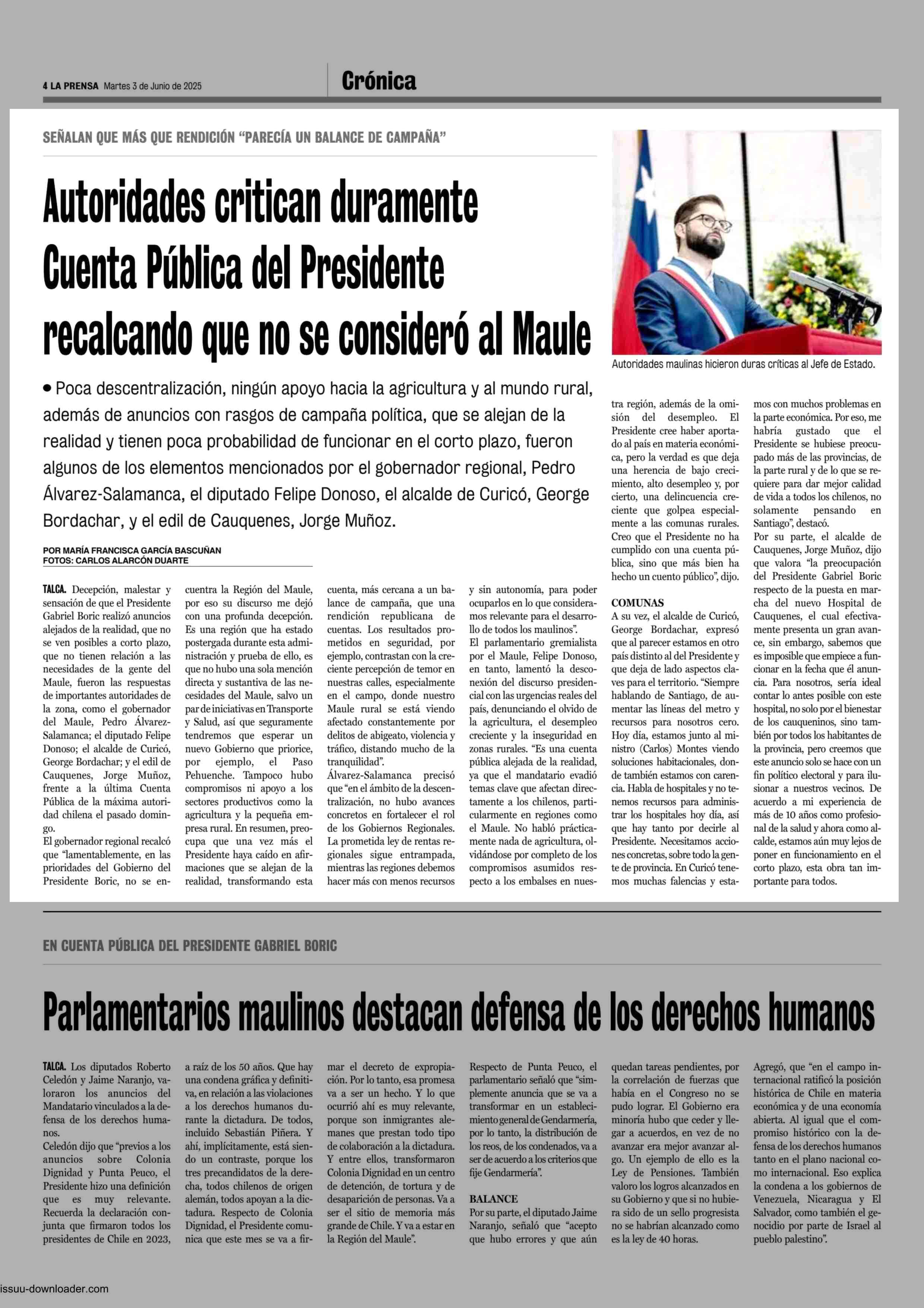 Autoridades critican duramente Cuenta Pública del Presidente recalcando que no se consideró al Maule 03-06-2025 La Prensa de Curicó |