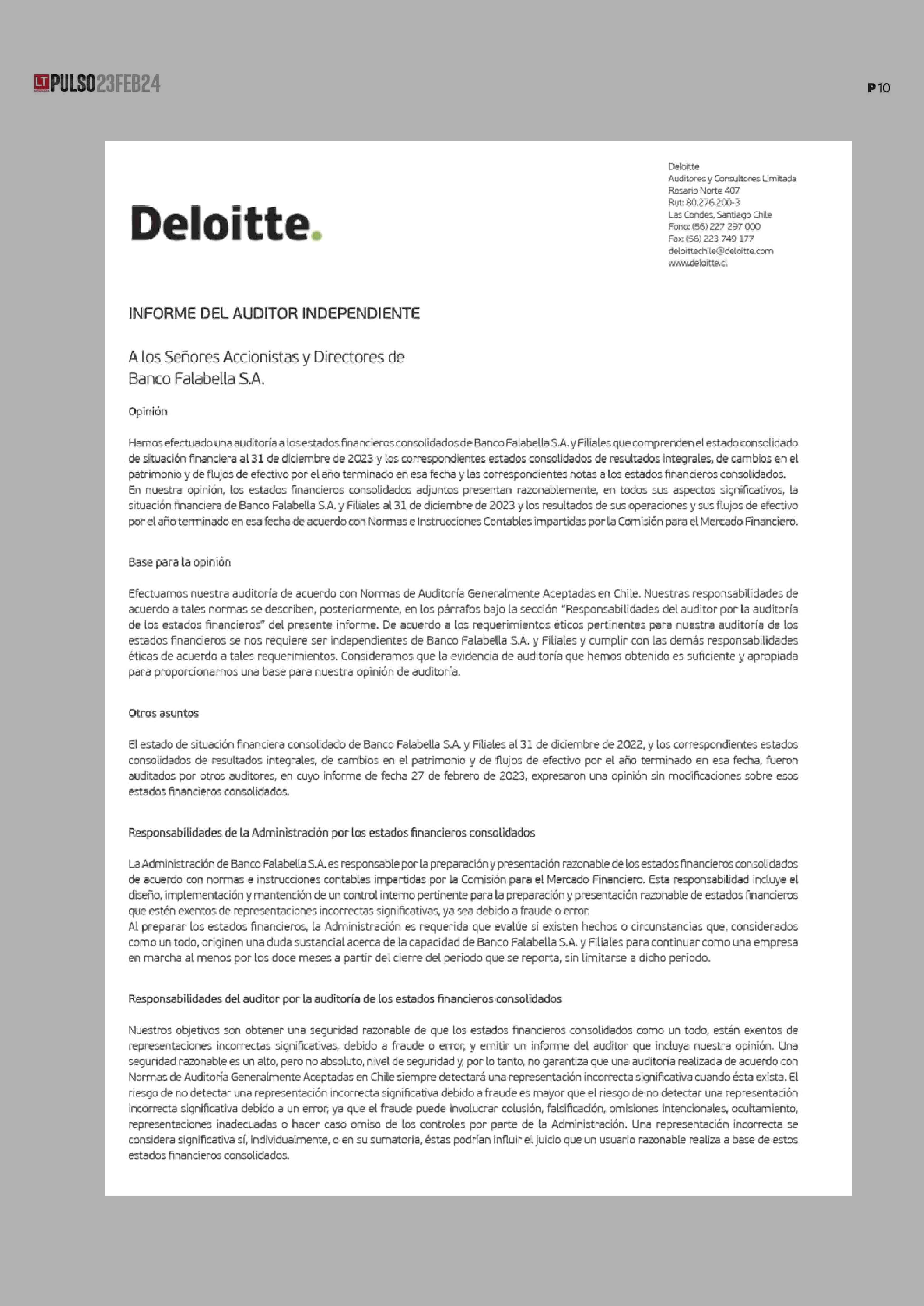 EXTRACTOS: BANCO FALABELLA Y FILIALES ESTADOS DE SITUACIÓN FINANCIERA CONSOLIDADOS 23-02-2024 La Tercera |
