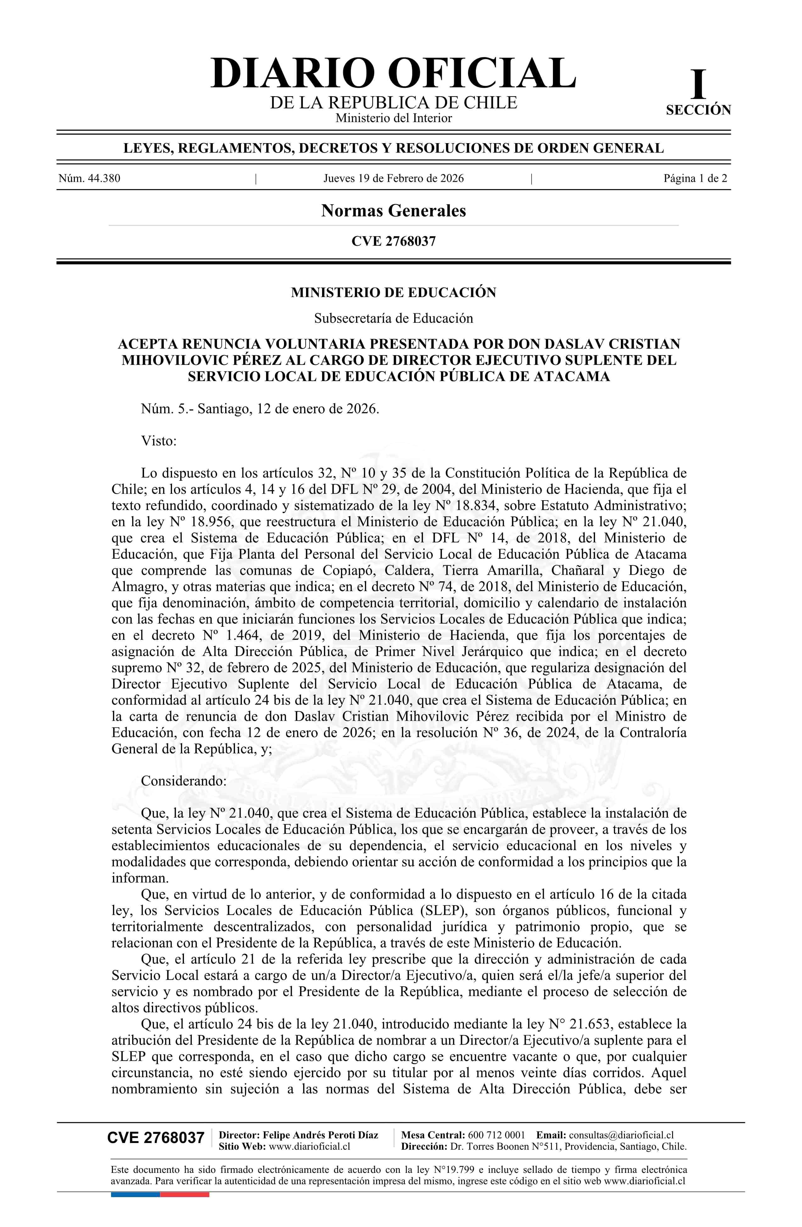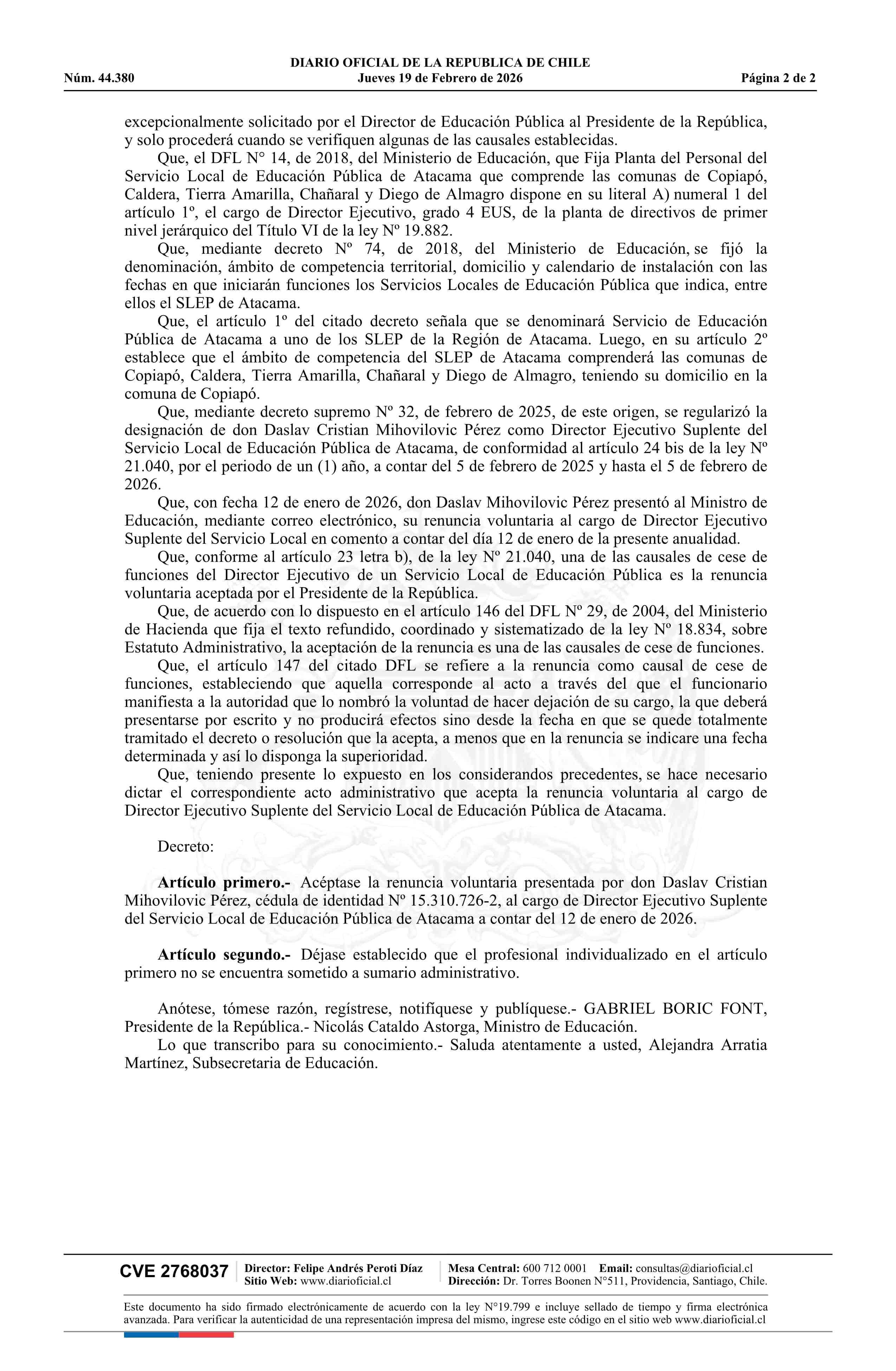 Título: Decreto número 5, de 2026.- Acepta renuncia voluntaria presentada por don Daslav Cristian Mihovilovic Pérez al cargo de Director Ejecutivo Suplente del Servicio Local de Educación Pública de Atacama