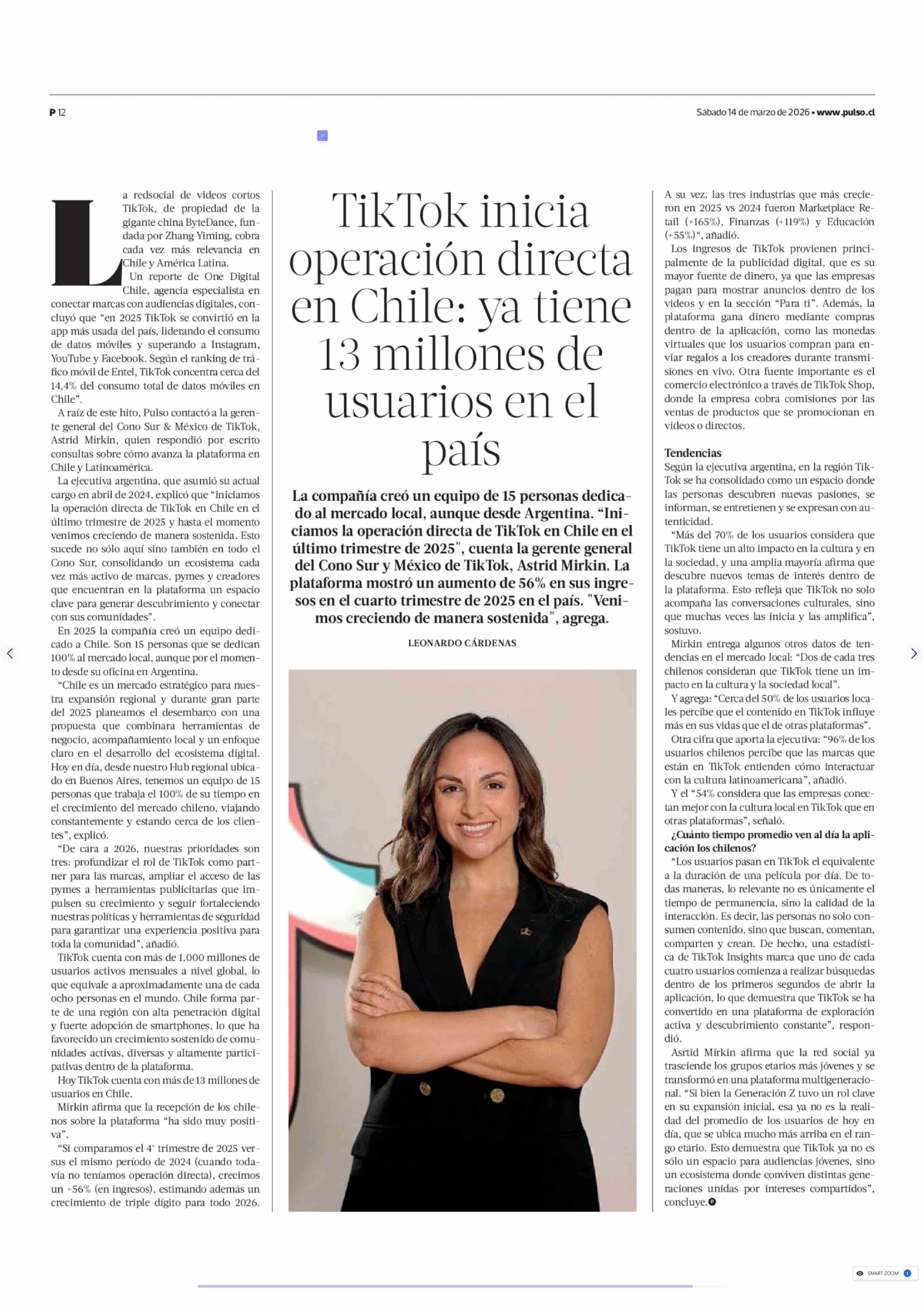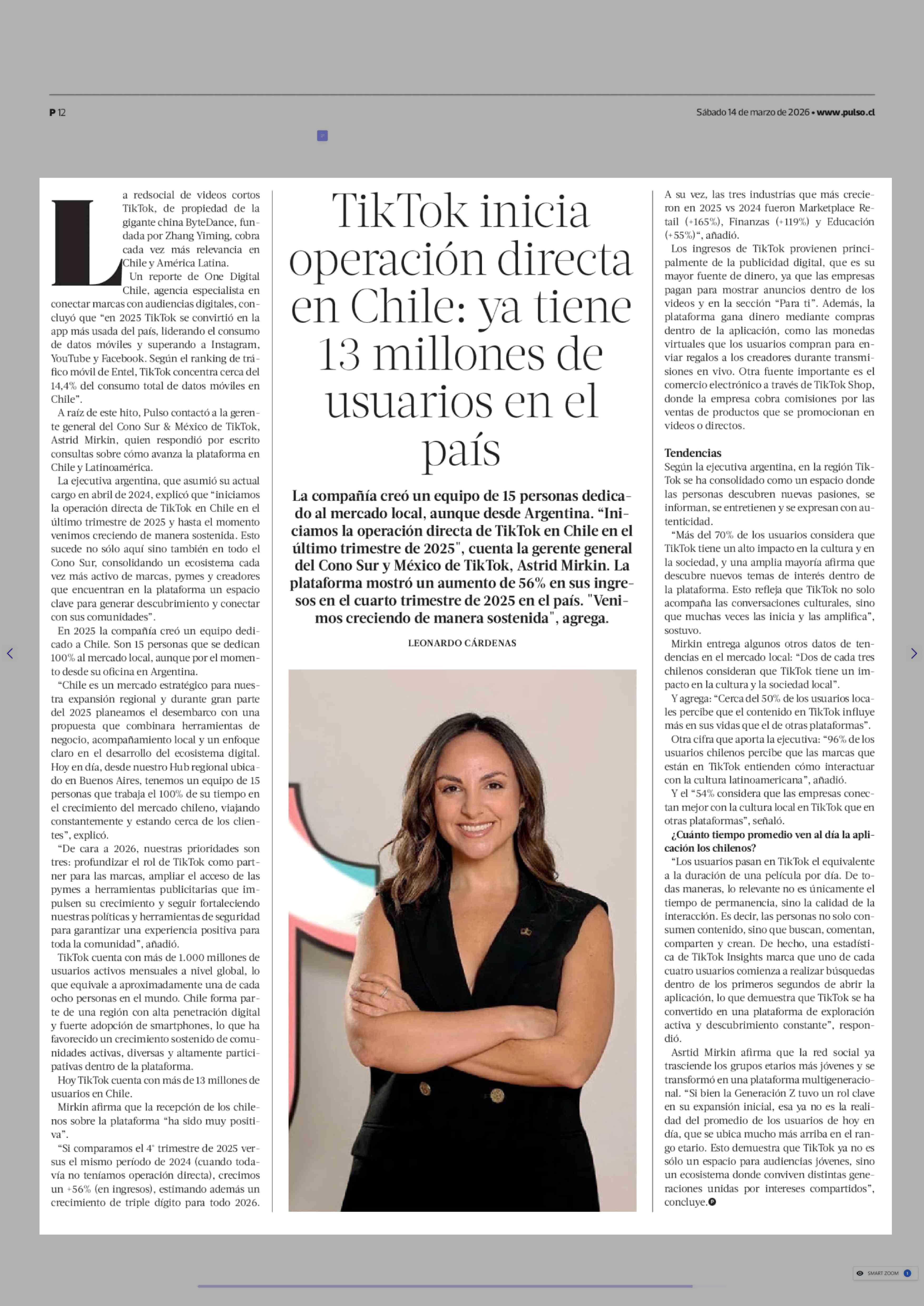 TikTok inicia operación directa en Chile: ya tiene 13 millones de usuarios en el país 14-03-2026 La Tercera |