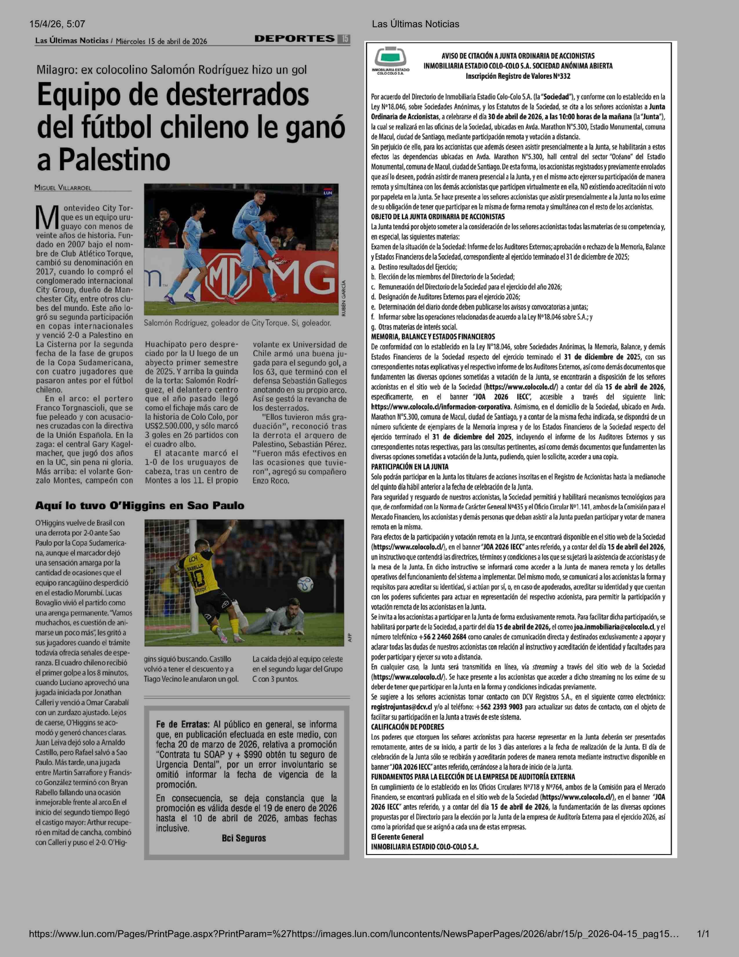Título: CITACIÓN A JUNTA ORDINARIA DE INMOBILIARIA ESTADIO COLO-COLO S.A. SOCIEDAD ANÓNIMA ABIERTA
