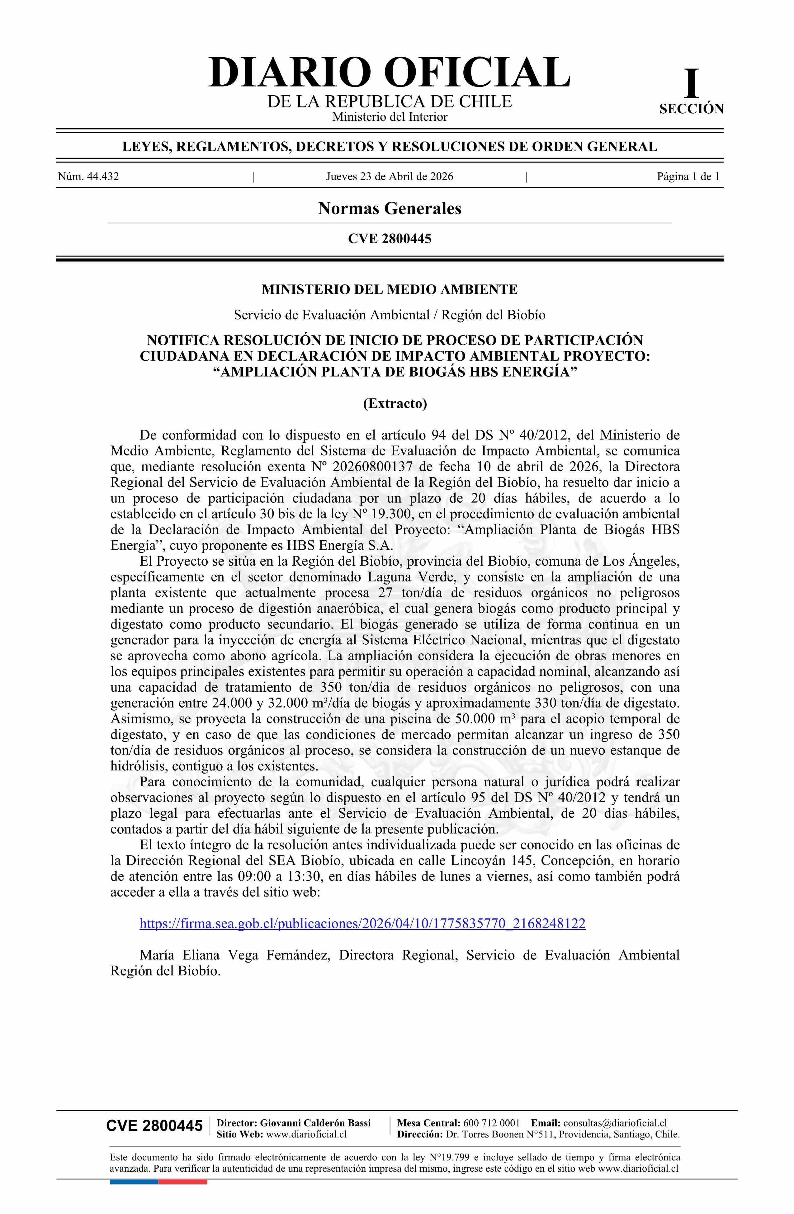 Título: Extracto de resolución exenta número 20260800137, de 2026.- Inicia proceso de participación ciudadana en Declaración de Impacto Ambiental del proyecto Ampliación Planta de Biogás HBS Energía