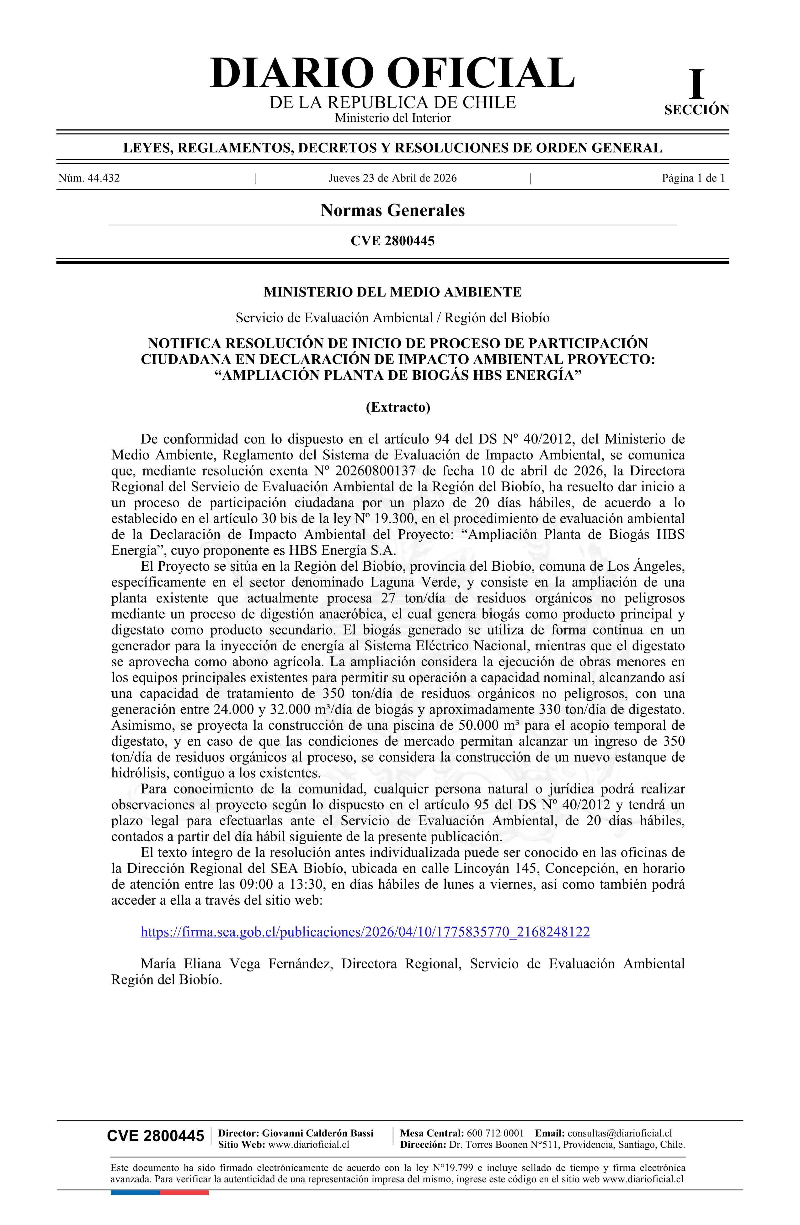 Extracto de resolución exenta número 20260800137, de 2026.- Inicia proceso de participación ciudadana en Declaración de Impacto Ambiental del proyecto Ampliación Planta de Biogás HBS Energía