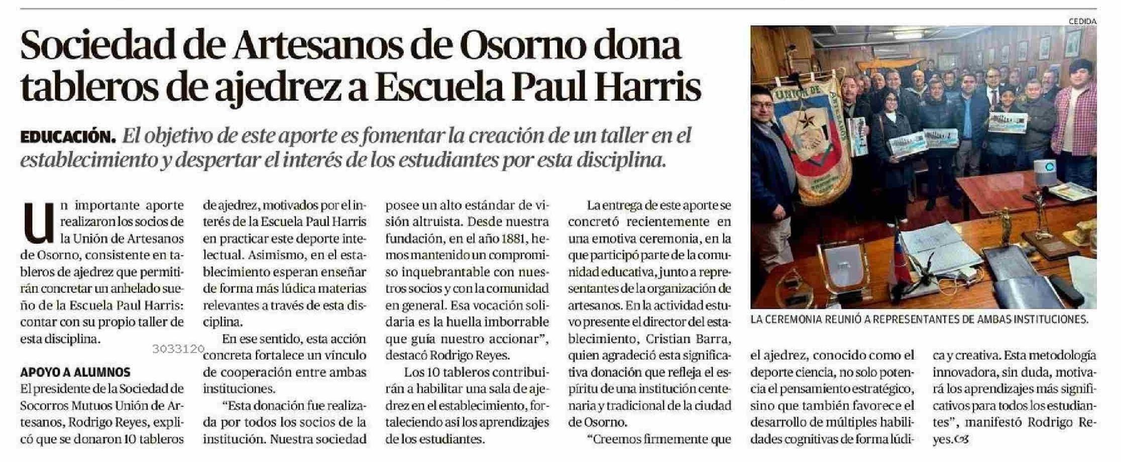 Sociedad de Artesanos de Osorno dona tableros de ajedrez a Escuela Paul Harris 24-06-2025 El Austral de Osorno |