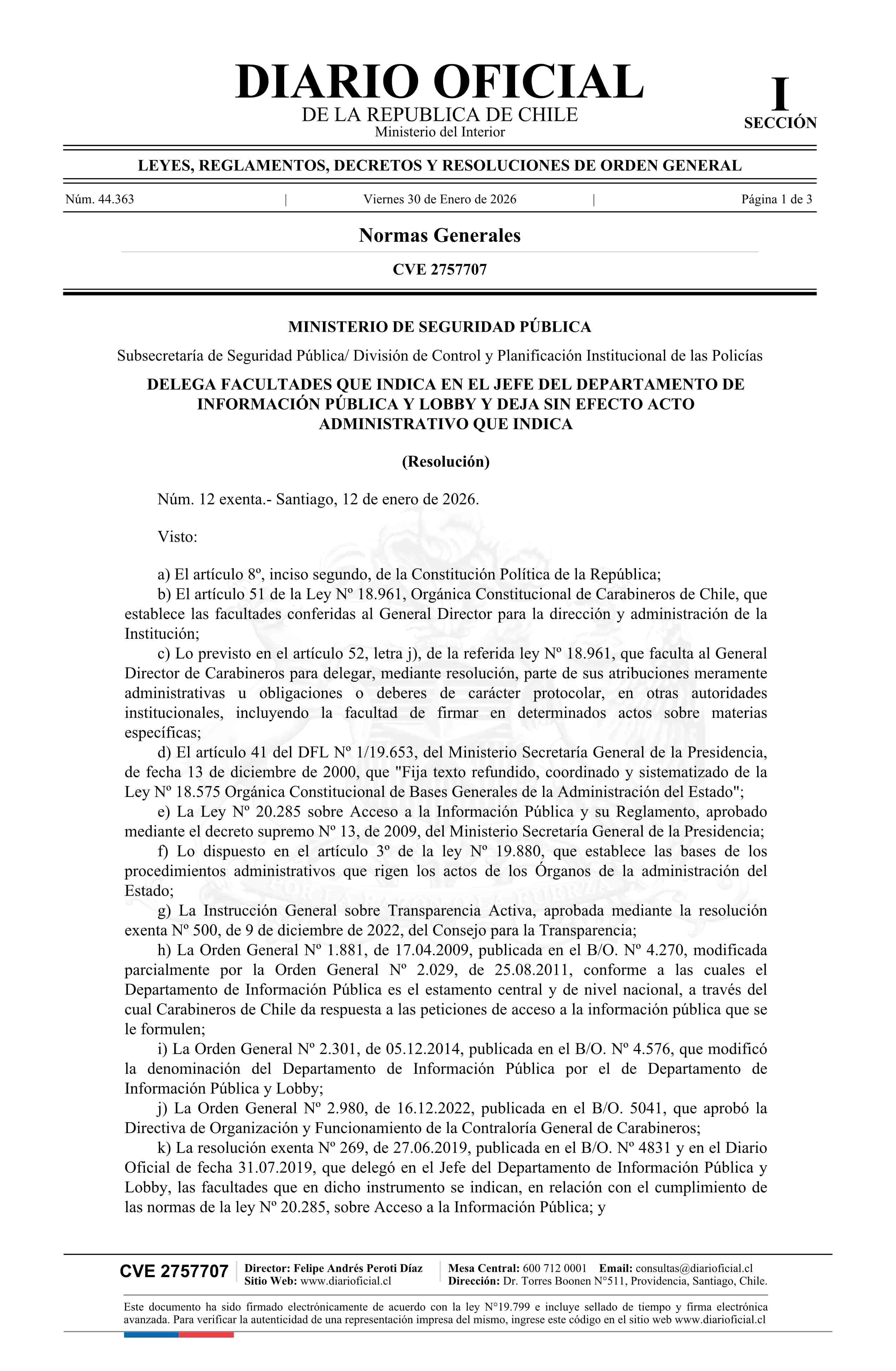 Resolución exenta número 12, de 2026.- Delega facultades que indica en el Jefe del Departamento de Información Pública y Lobby y deja sin efecto acto administrativo que indica 30-01-2026 DIARIO OFICIAL CHILE - BOLETÍN OFICIAL DE MINERÍA |