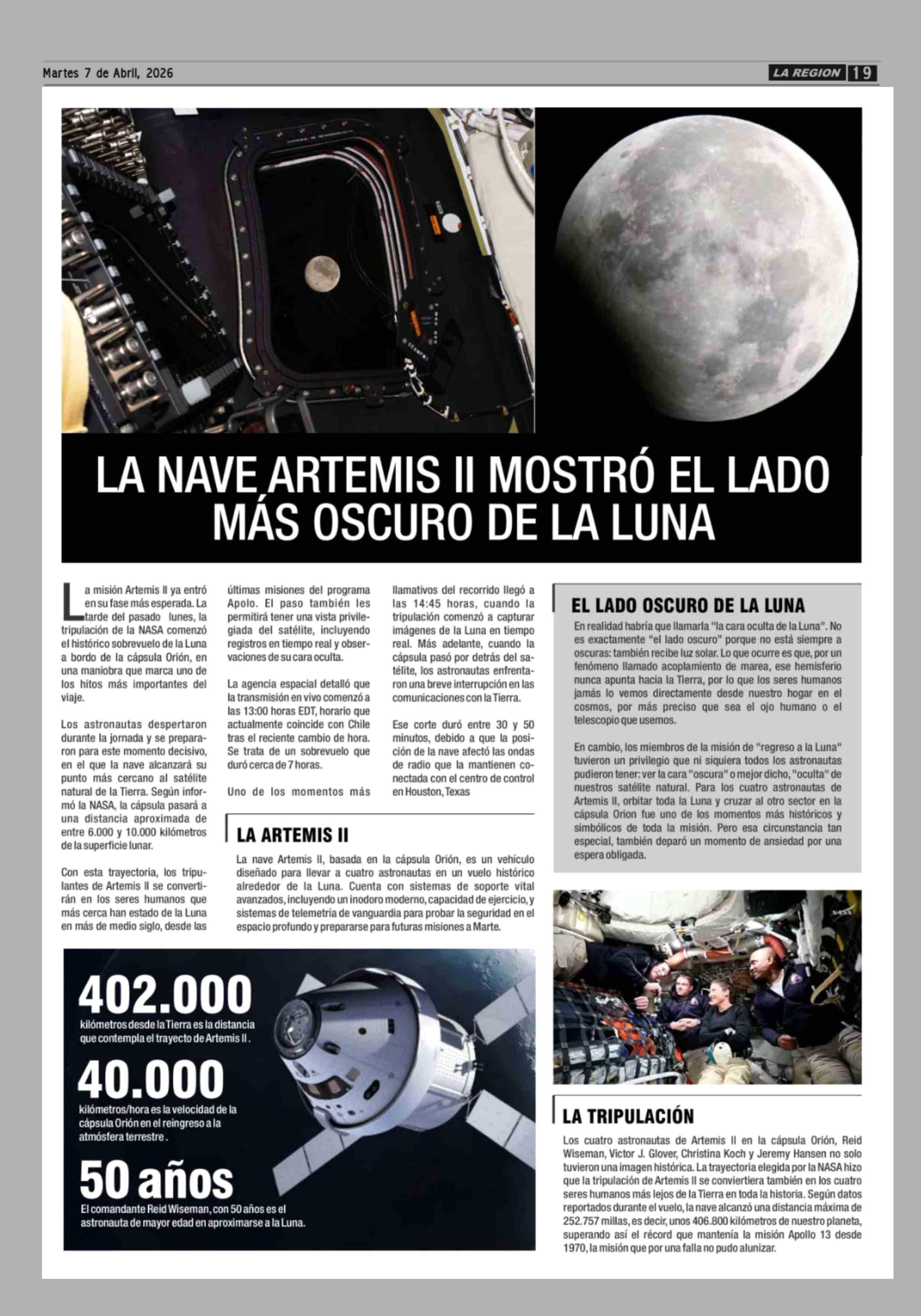 LA NAVE ARTEMIS II MOSTRÓ EL LADO MÁS OSCURO DE LA LUNA 07-04-2026 Diario la Región |