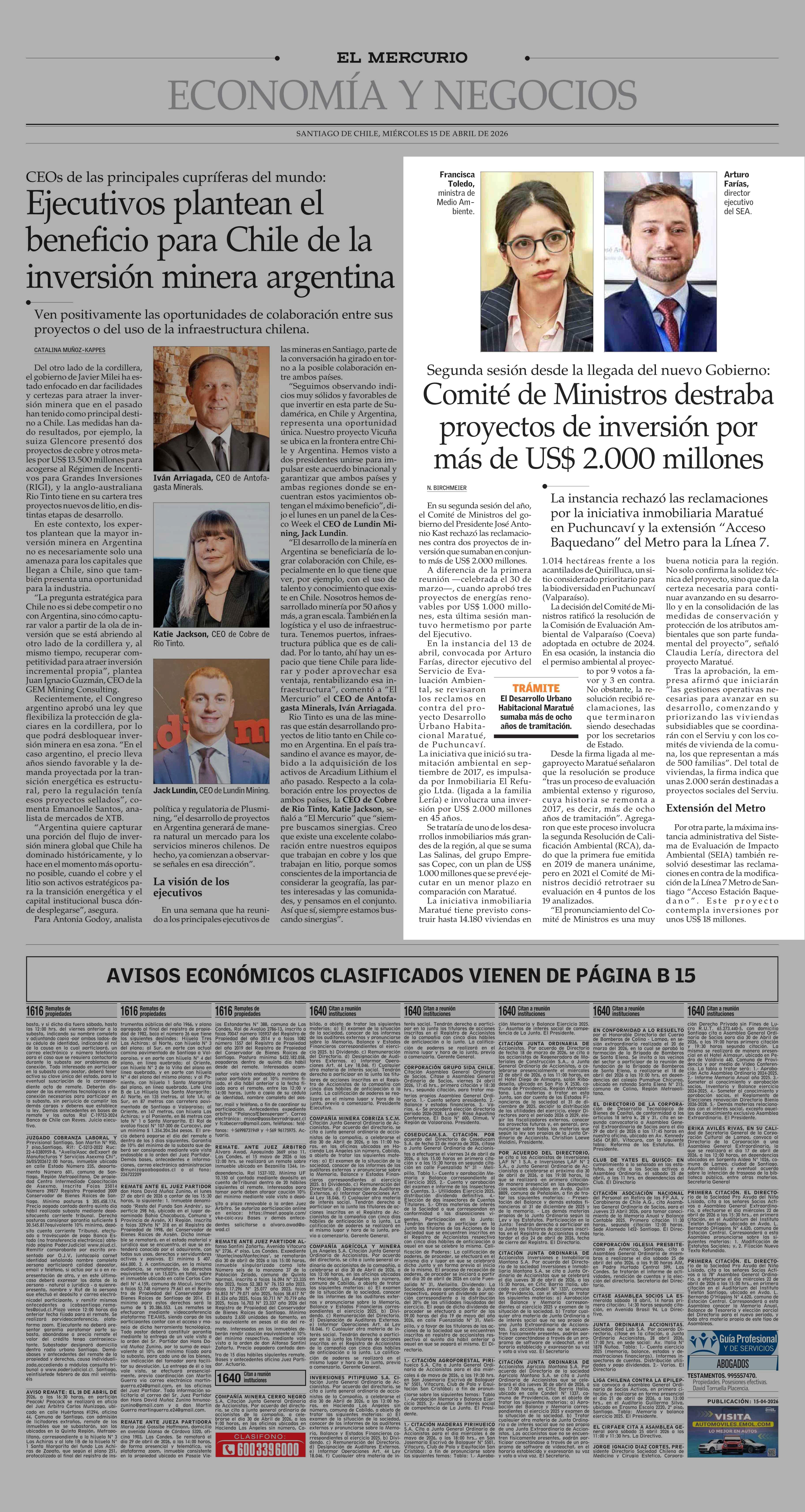 Comité de Ministros destraba proyectos de inversión por más de US$ 2.000 millones 15-04-2026 El Mercurio |