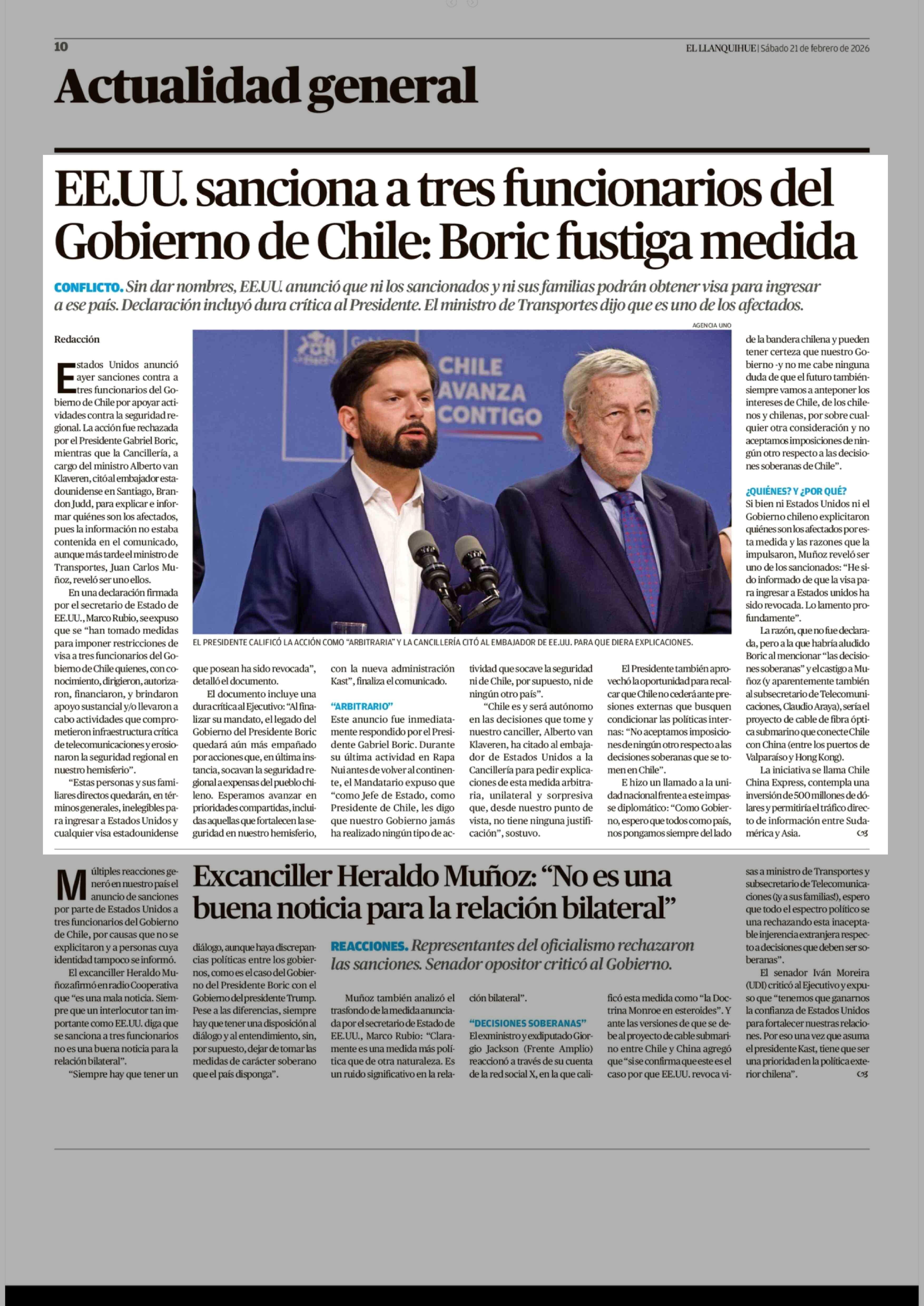 Título: EE.UU. sanciona a tres funcionarios del Gobierno de Chile: Boric fustiga medida