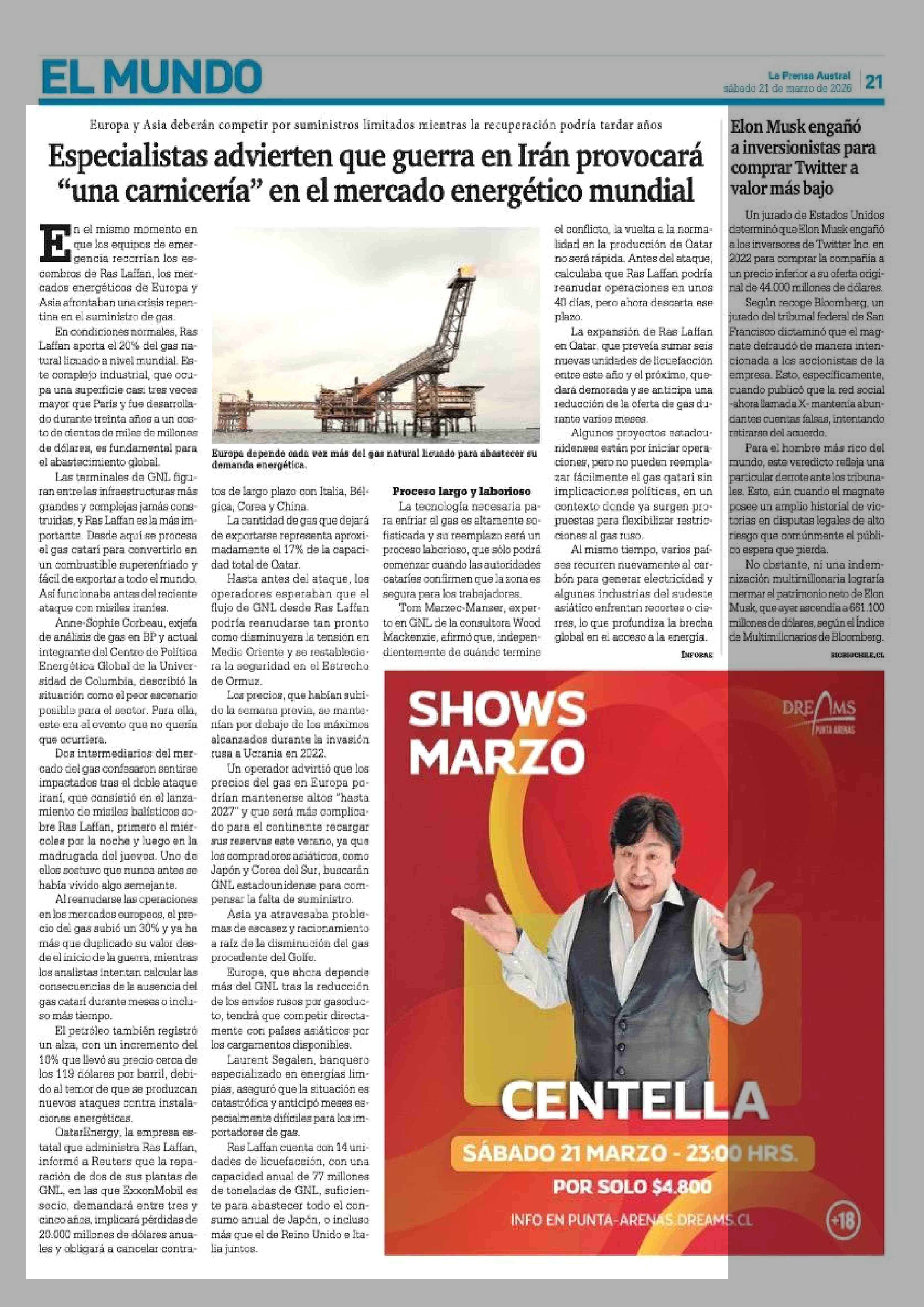 Especialistas advierten que guerra en Irán provocará "una carnicería" en el mercado energético mundial 21-03-2026 La Prensa Austral |