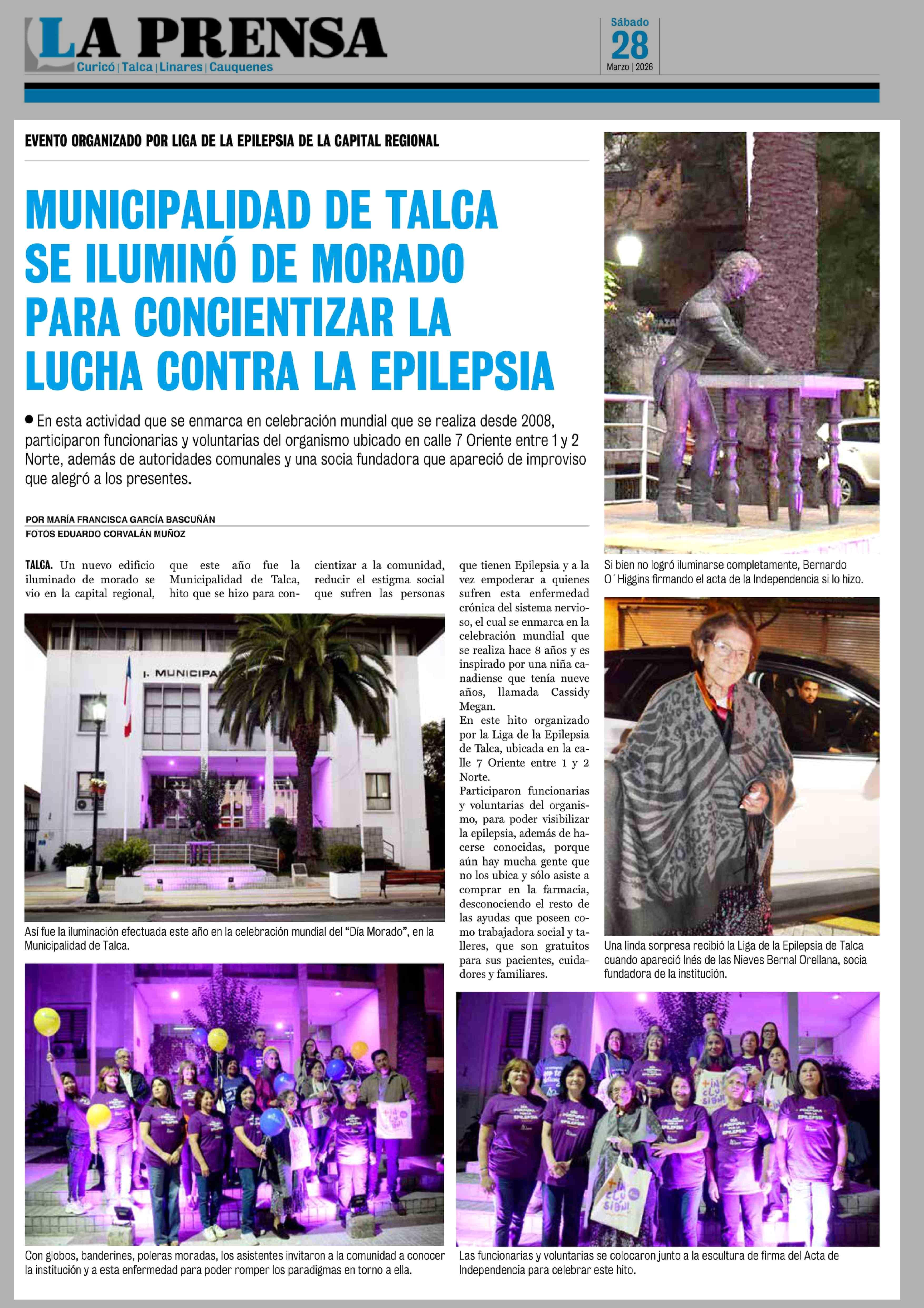 MUNICIPALIDAD DE TALCA SE ILUMINÓ DE MORADO PARA CONCIENTIZAR LA LUCHA CONTRA LA EPILEPSIA 28-03-2026 La Prensa de Curicó |