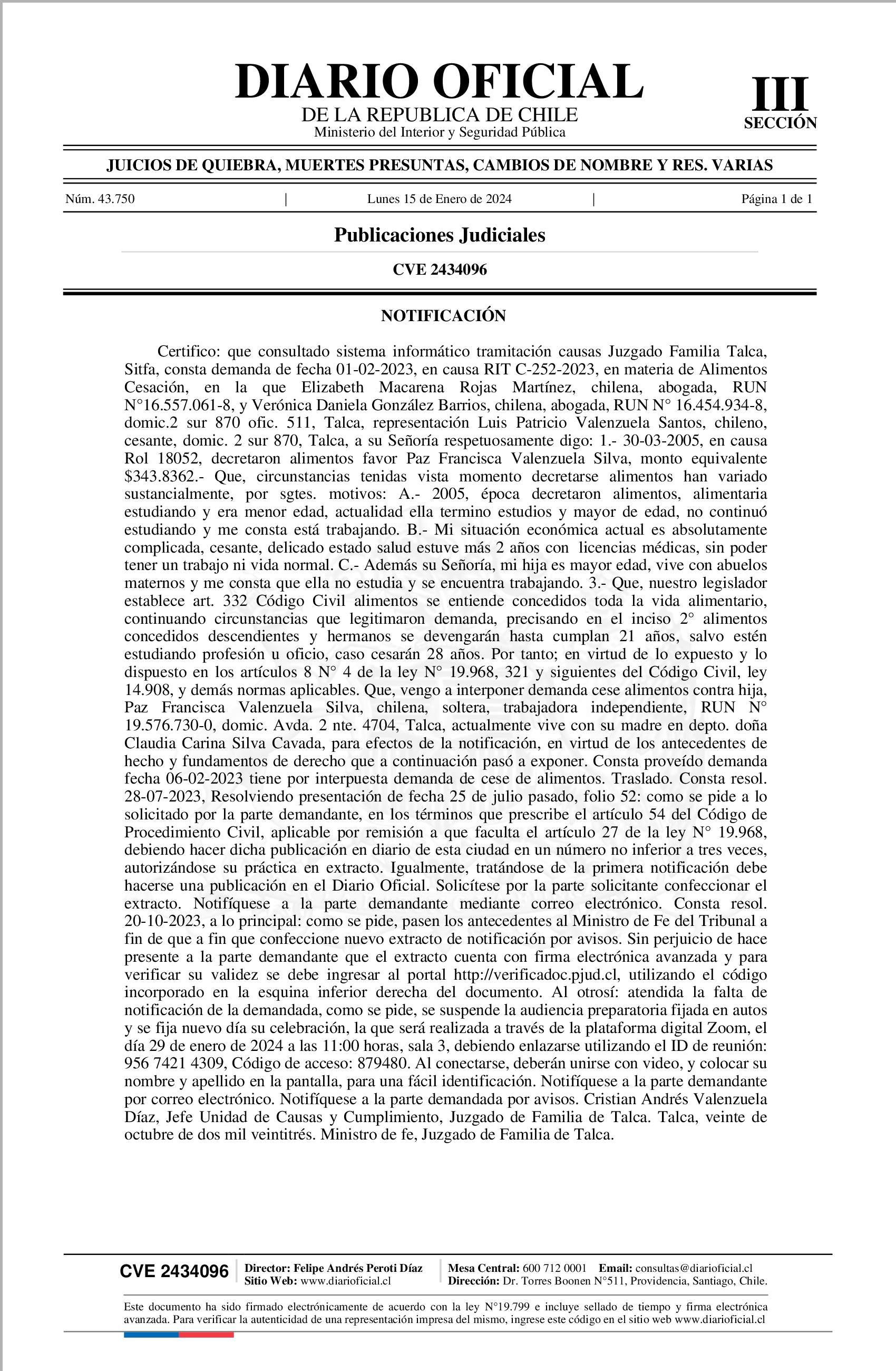 Notificación 15-01-2024 Diario Oficial Edición Electrónica |