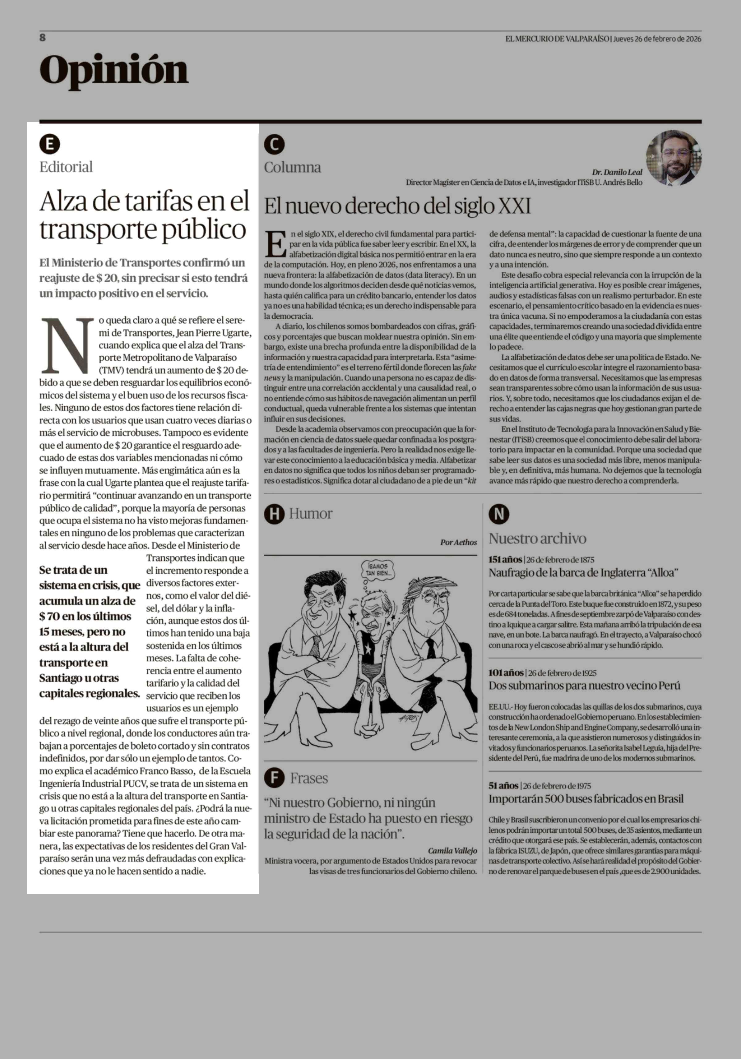 Editorial: Alza de tarifas en el transporte público 26-02-2026 El Mercurio de Valparaíso |
