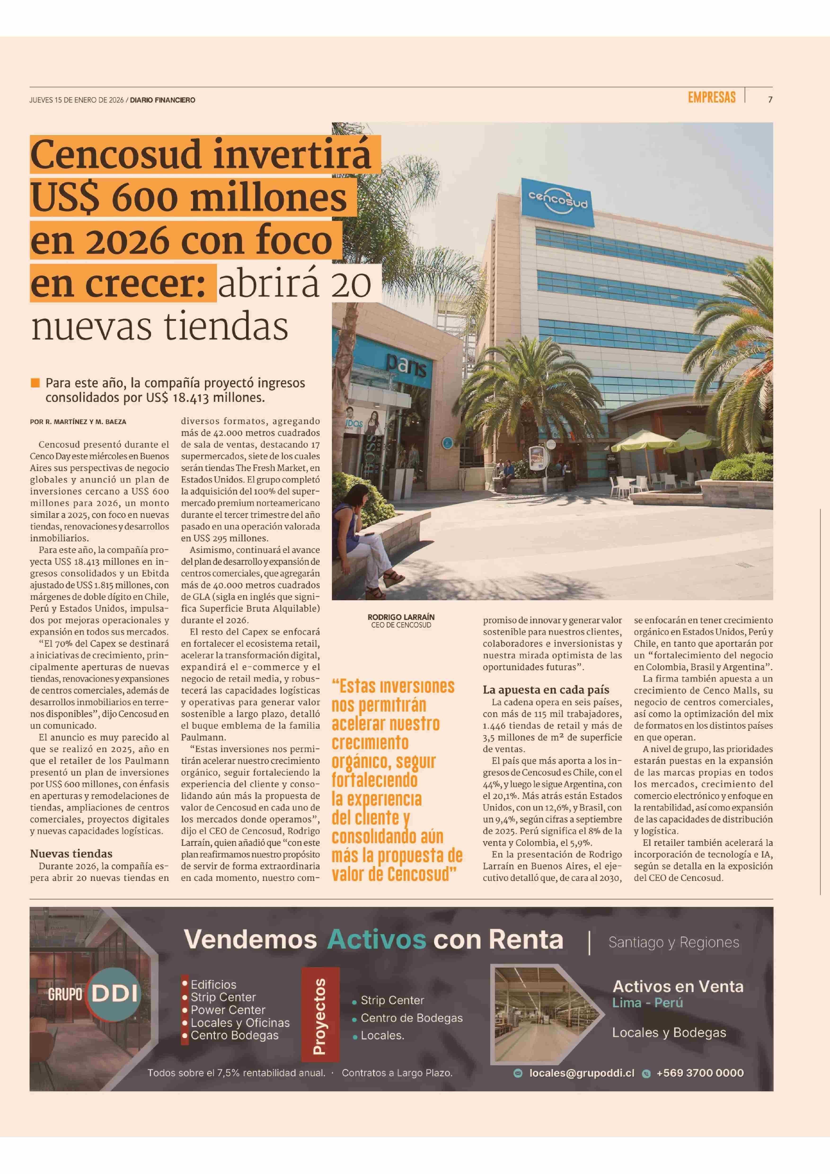 Cencosud invertirá US$ 600 millones en 2026 con foco en crecer: abrirá 20 nuevas tiendas 15-01-2026 Diario Financiero |