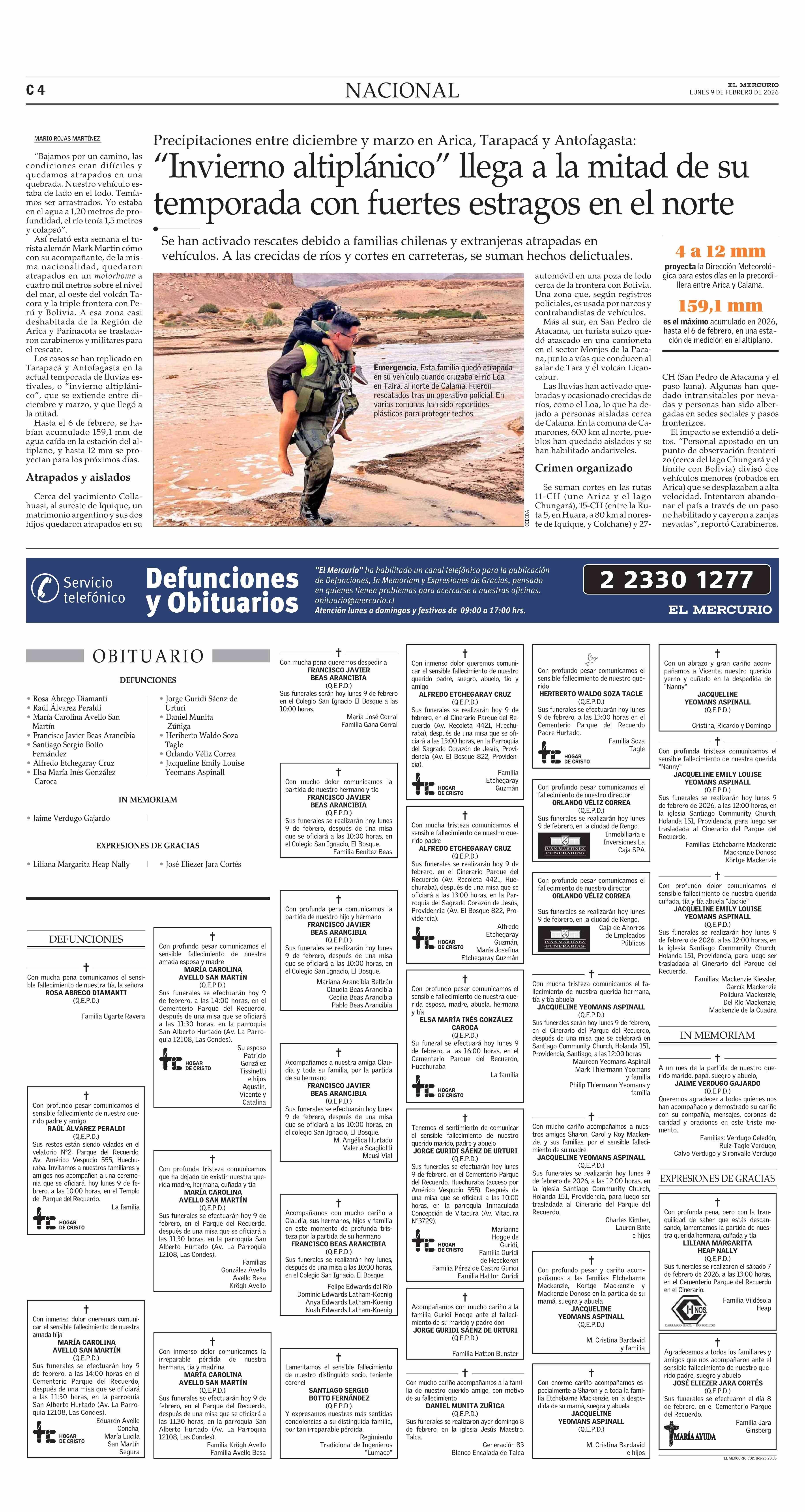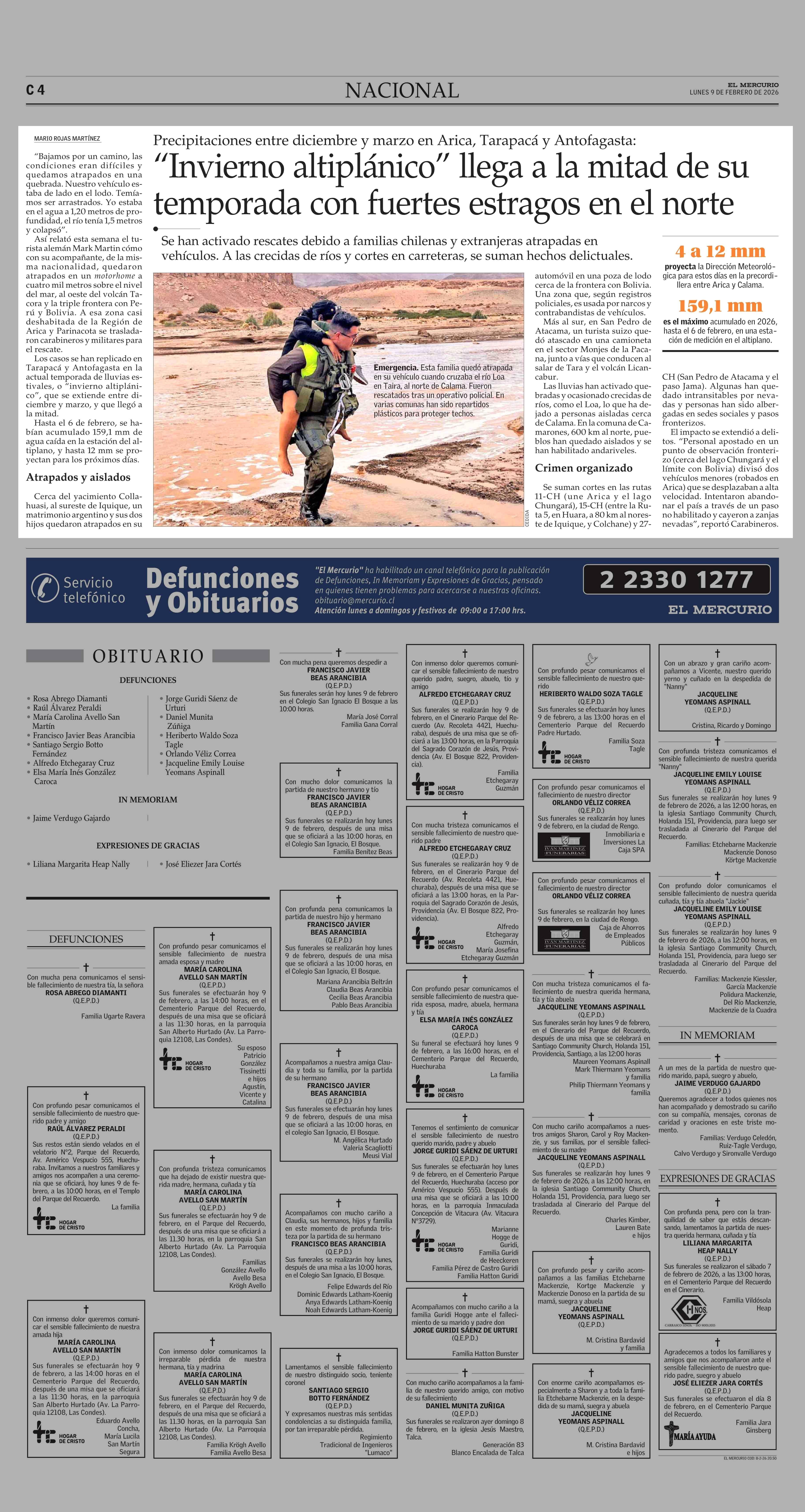 “Invierno altiplánico” llega a la mitad de su temporada con fuertes estragos en el norte 09-02-2026 El Mercurio |