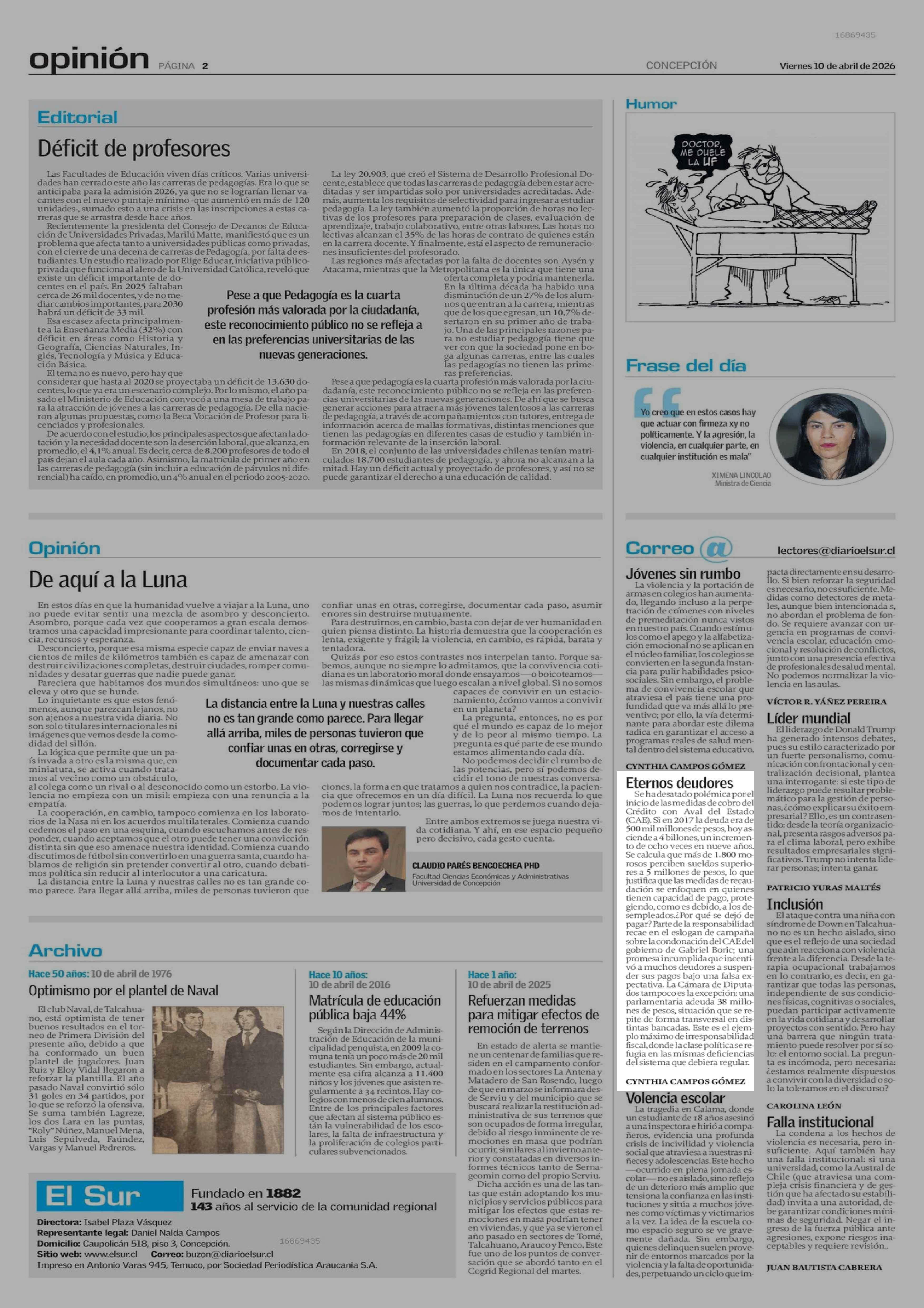 CARTAS: Eternos deudores 10-04-2026 El Sur |