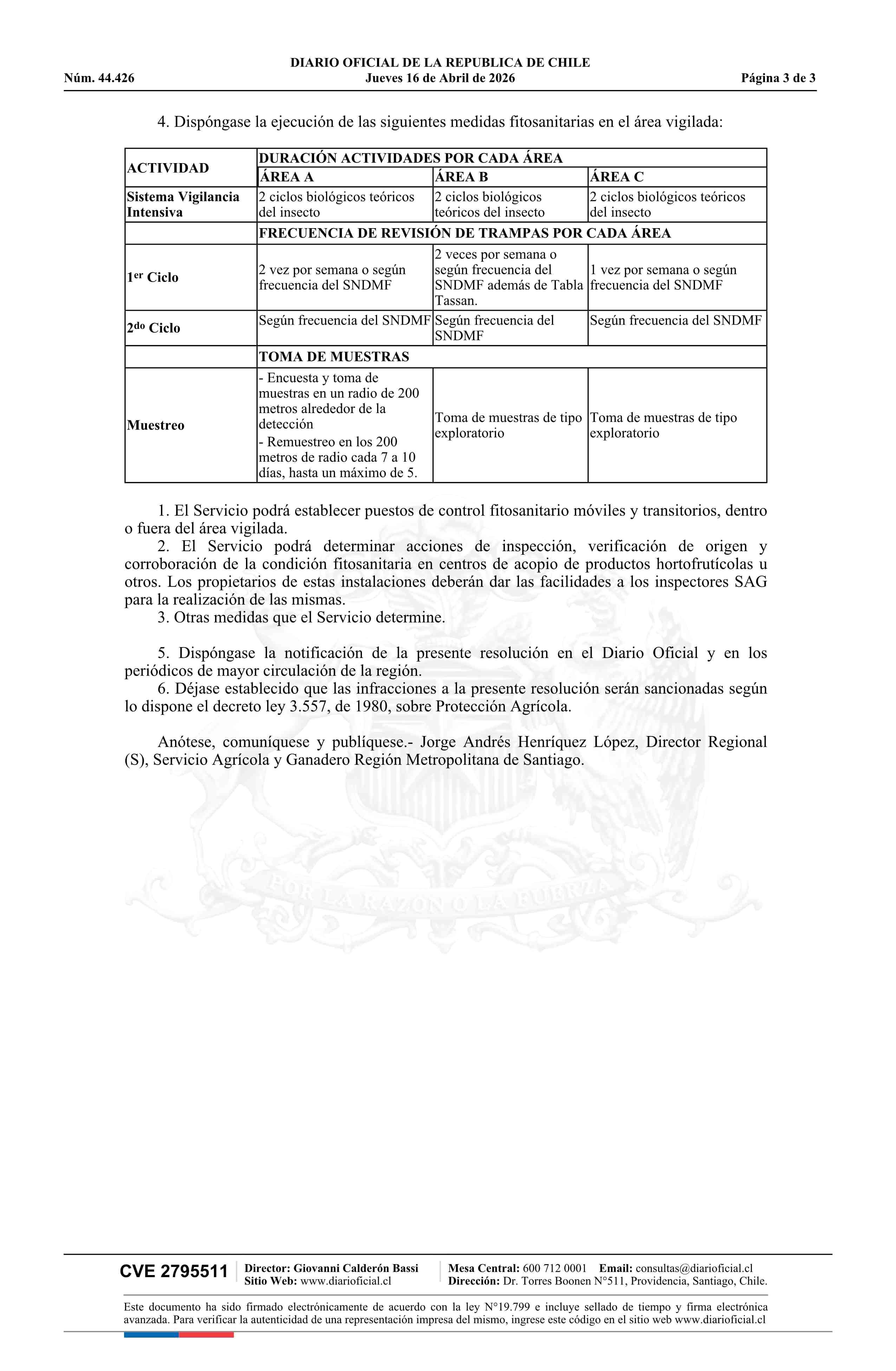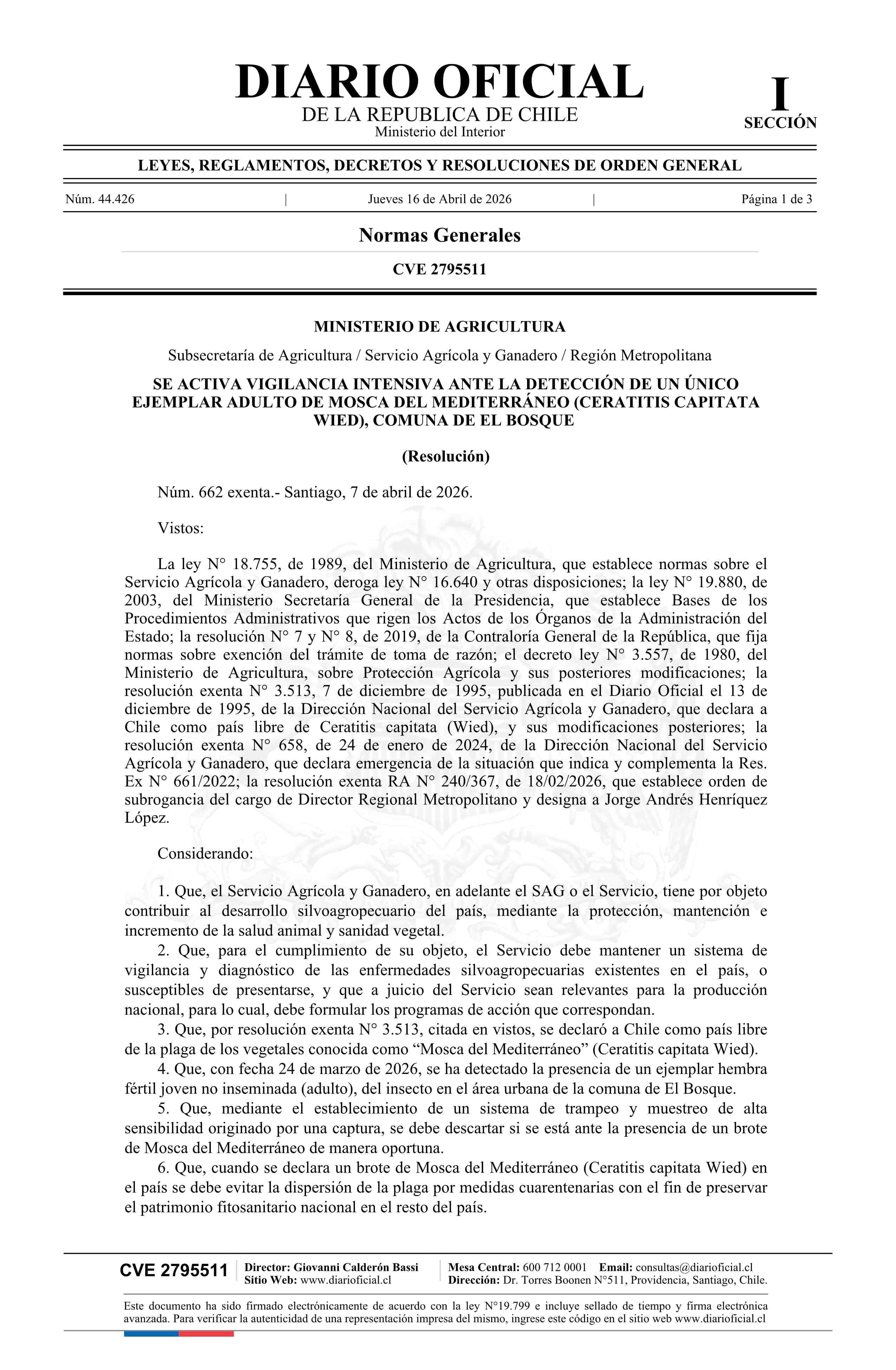 Título: Resolución exenta número 662, de 2026.- Se activa vigilancia intensiva ante la detección de un único ejemplar adulto de Mosca del Mediterráneo (Ceratitis capitata Wied), comuna de El Bosque
