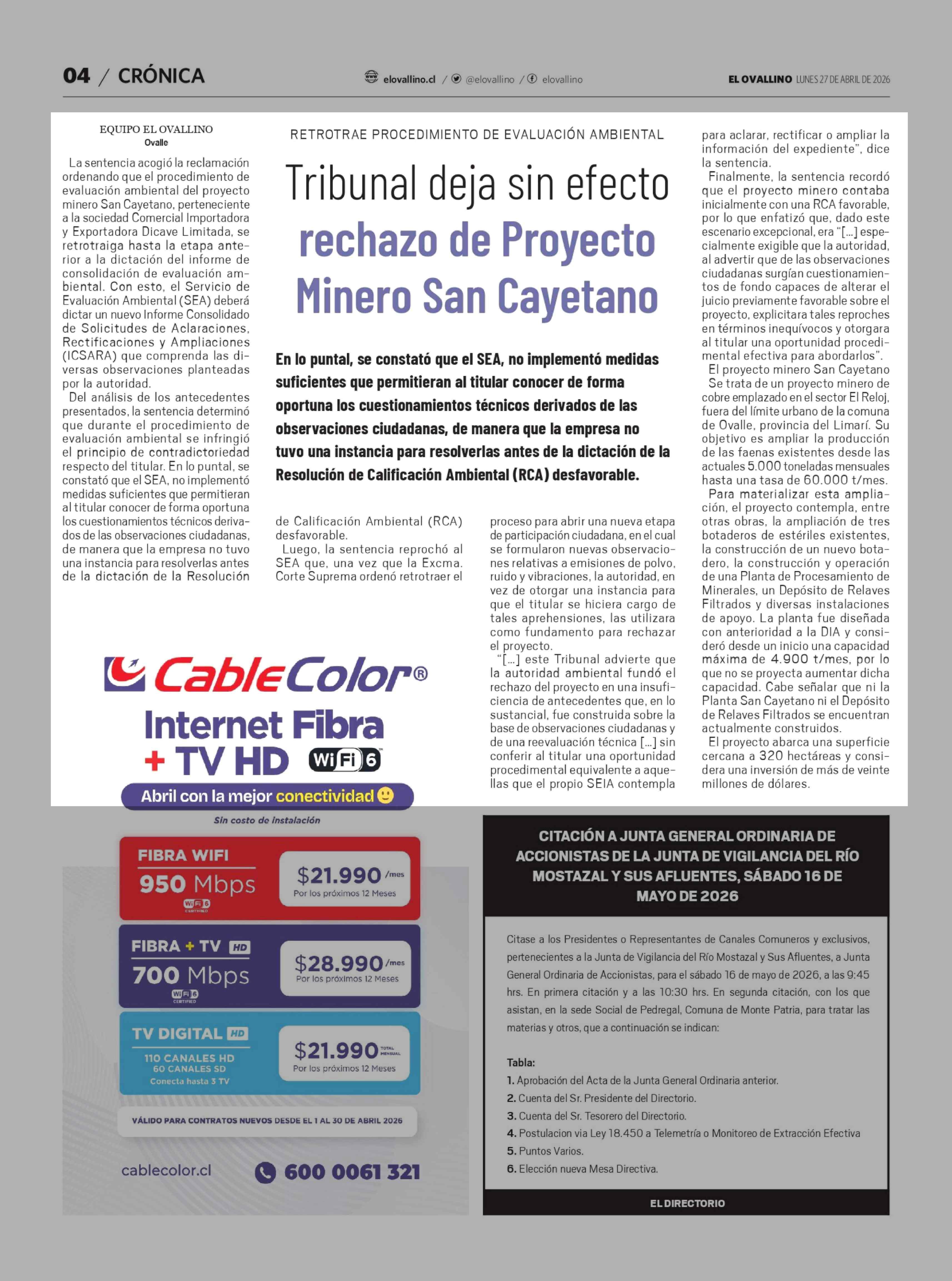 Tribunal deja sin efecto rechazo de Proyecto Minero San Cayetano 27-04-2026 El Ovallino |