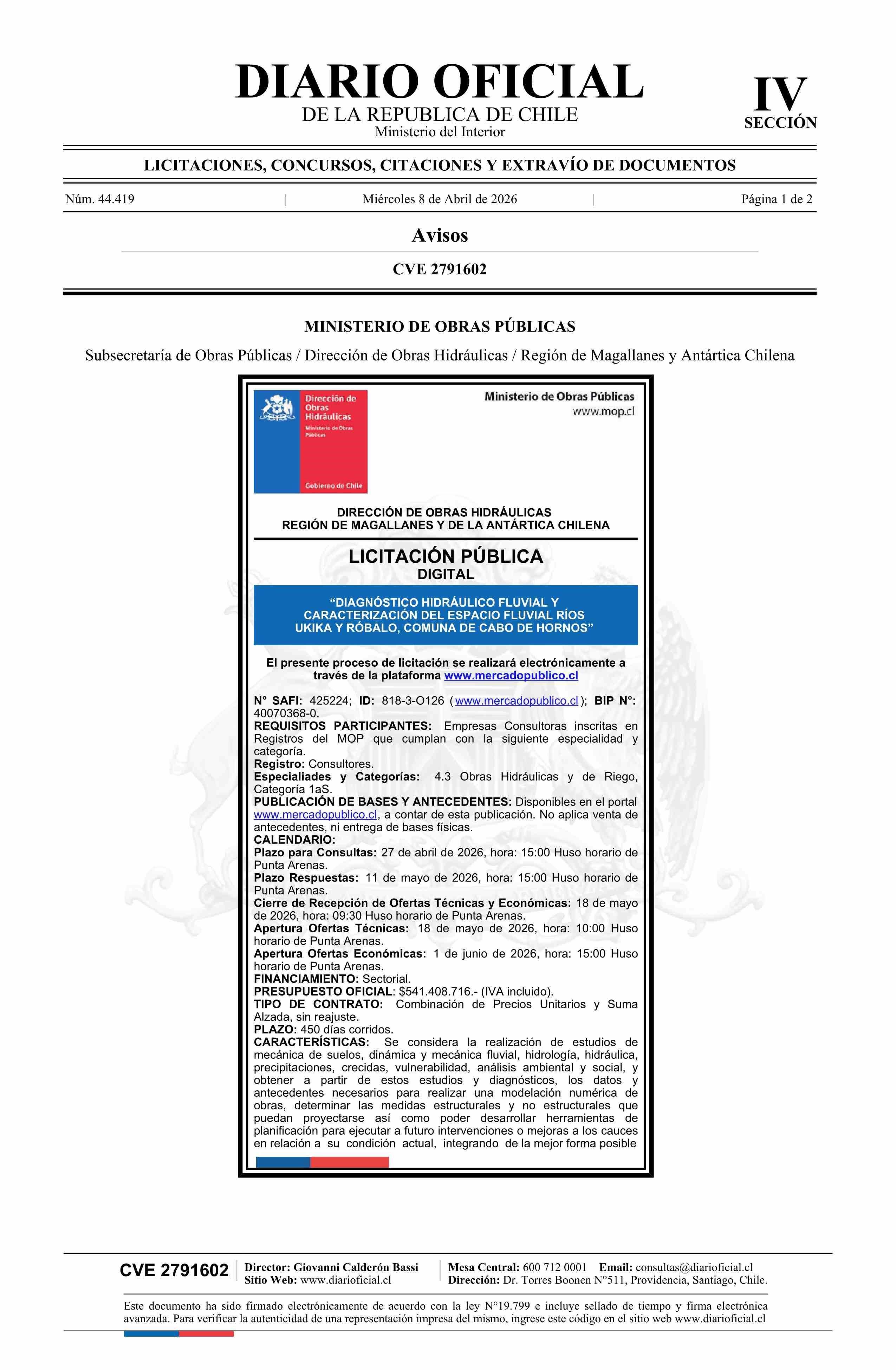 AVISO LICITACIONES: Diagnóstico Hidráulico Fluvial y Caracterización del Espacio Fluvial Ríos Ukika y Róbalo, comuna de Cabo de Hornos 08-04-2026 Diario Oficial Edición Electrónica |