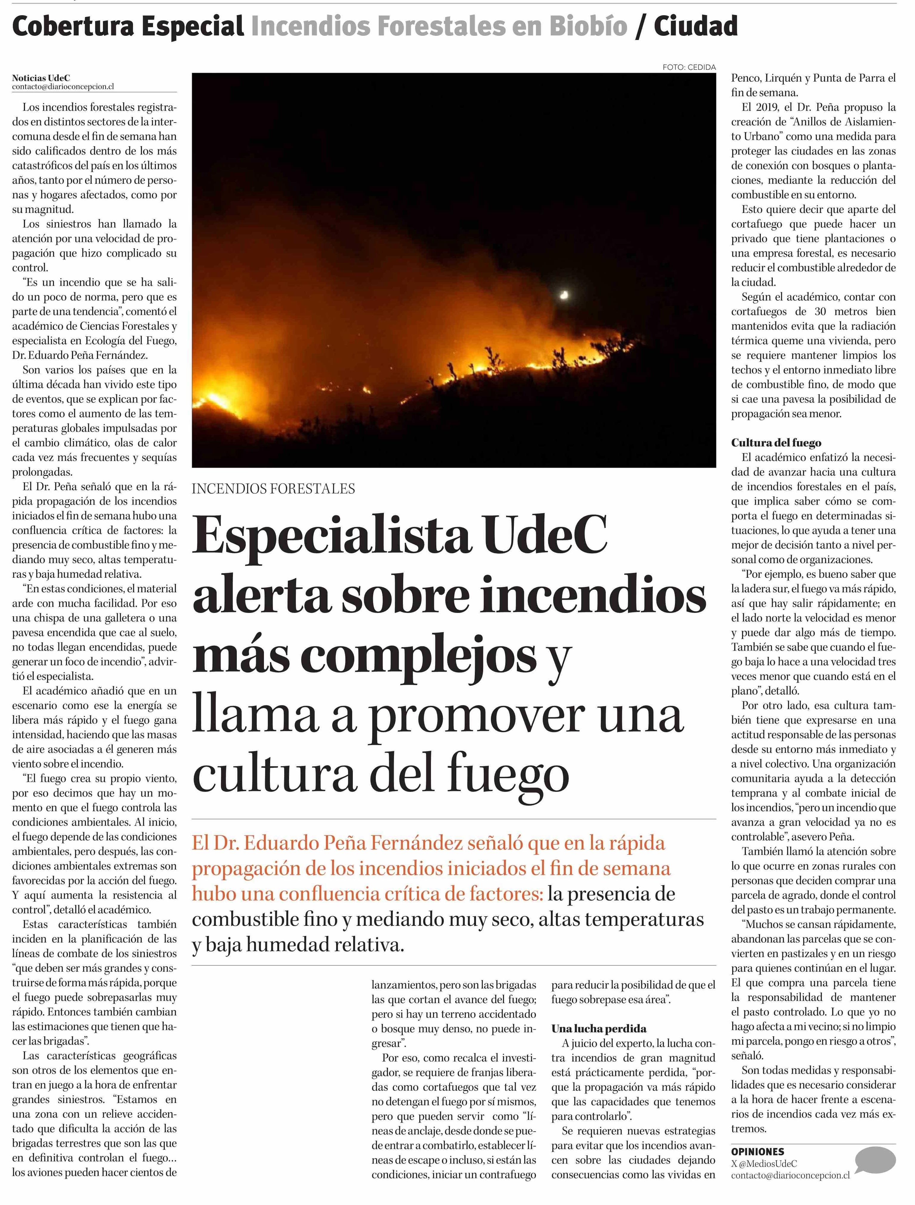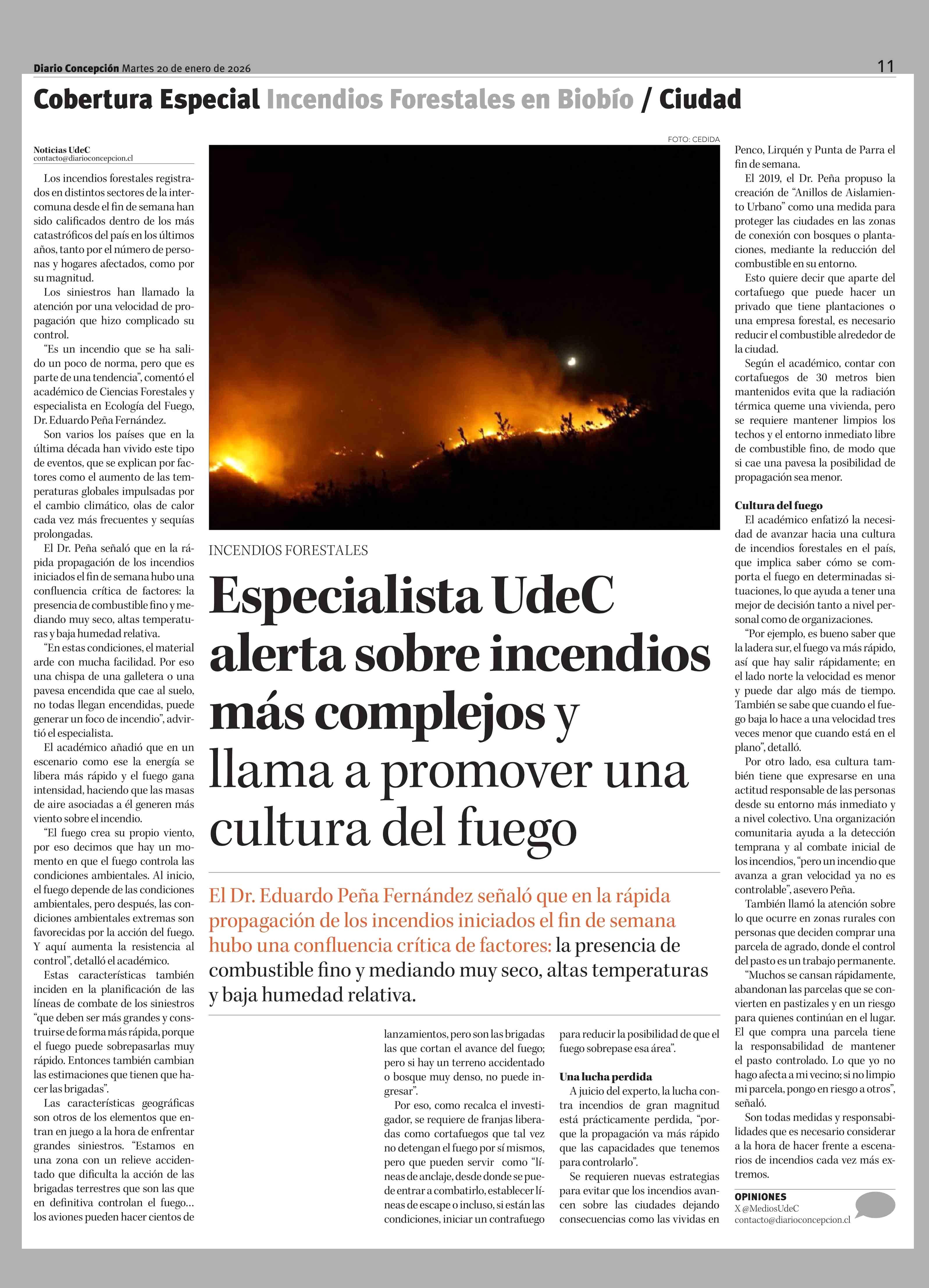 Especialista UdeC alerta sobre incendios más complejos y llama a promover una cultura del fuego 20-01-2026 Diario Concepción |