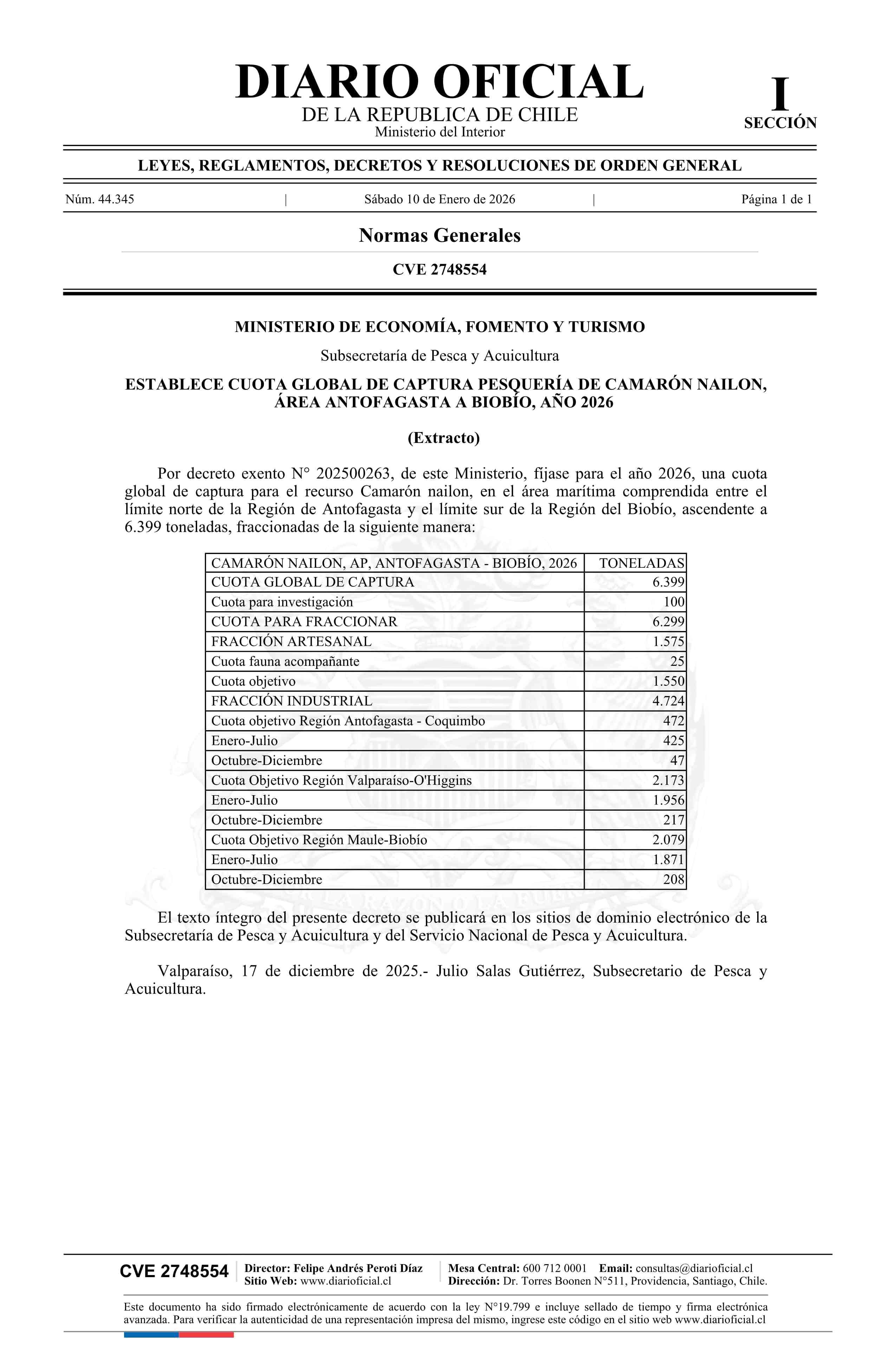 Título: Extracto de decreto exento número 202500263, de 2025.- Establece cuota global de captura pesquería de Camarón nailon, área Antofagasta a Biobío, año 2026