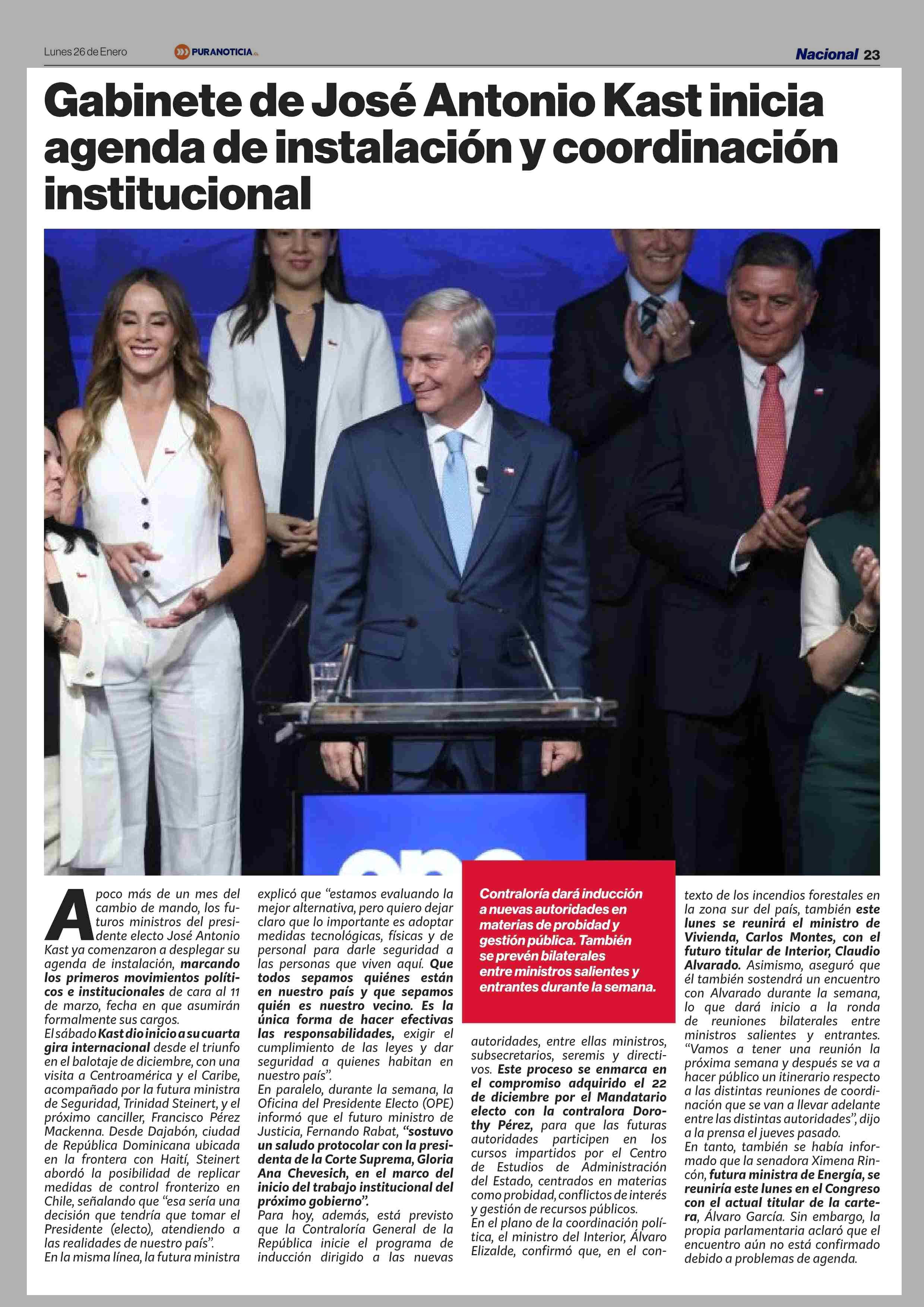 Gabinete de José Antonio Kast inicia agenda de instalación y coordinación institucional 26-01-2026 Puranoticia.cl |