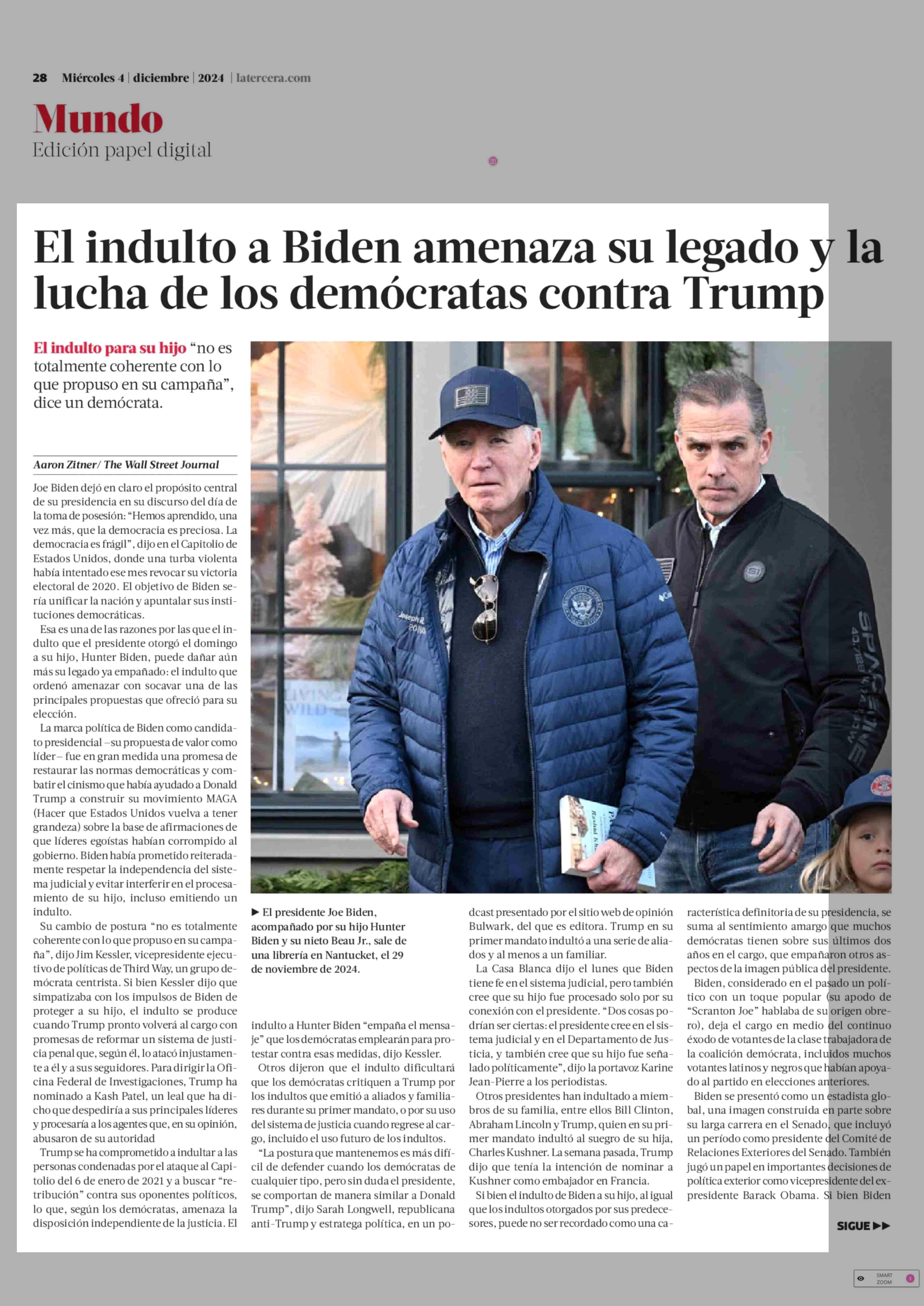 El indulto a Biden amenaza su legado y la lucha de los demócratas contra Trump 04-12-2024 La Tercera |