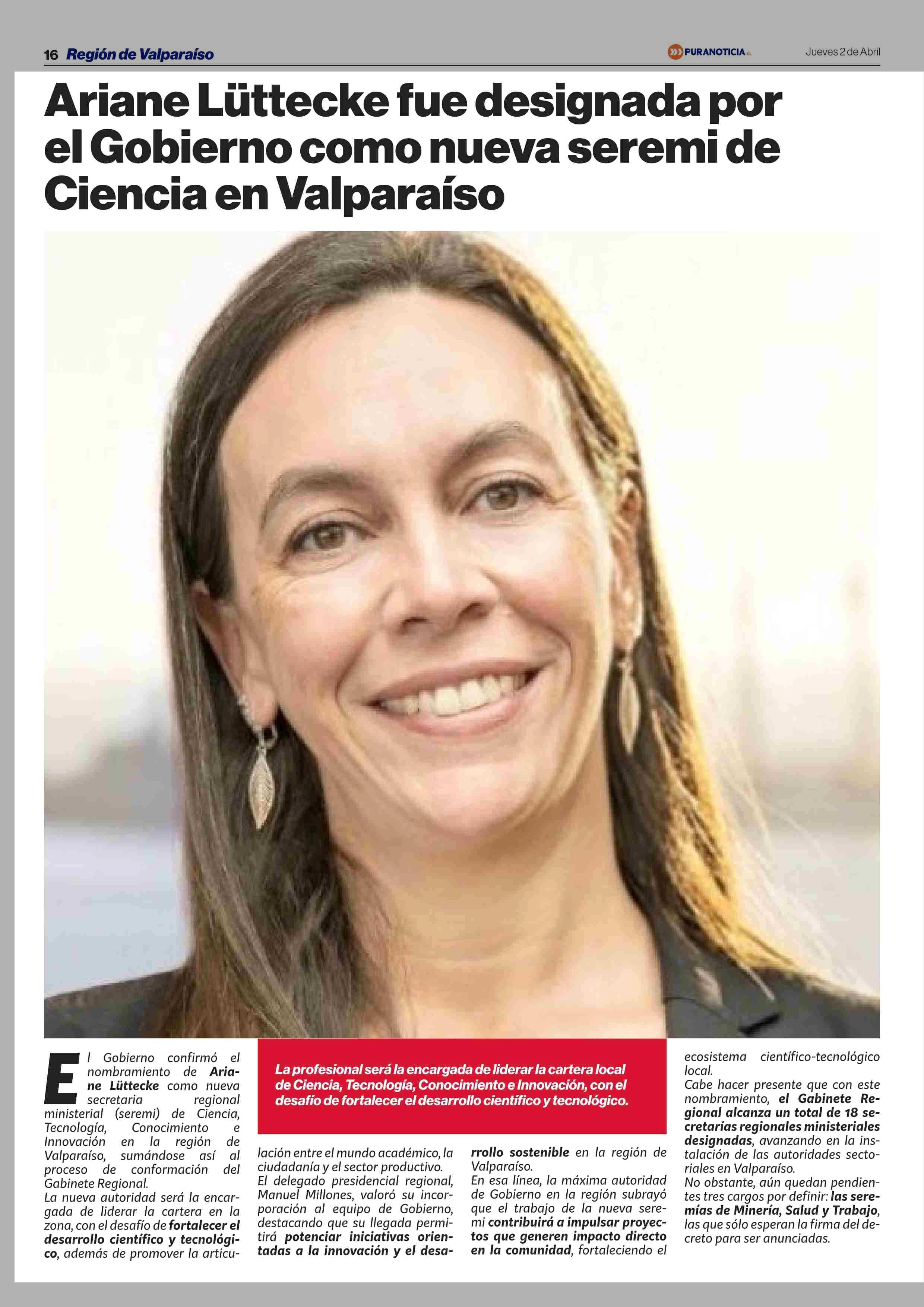 Ariane Lúttecke fue designada por el Gobierno como nueva seremi de Ciencia en Valparaíso 02-04-2026 Puranoticia.cl |
