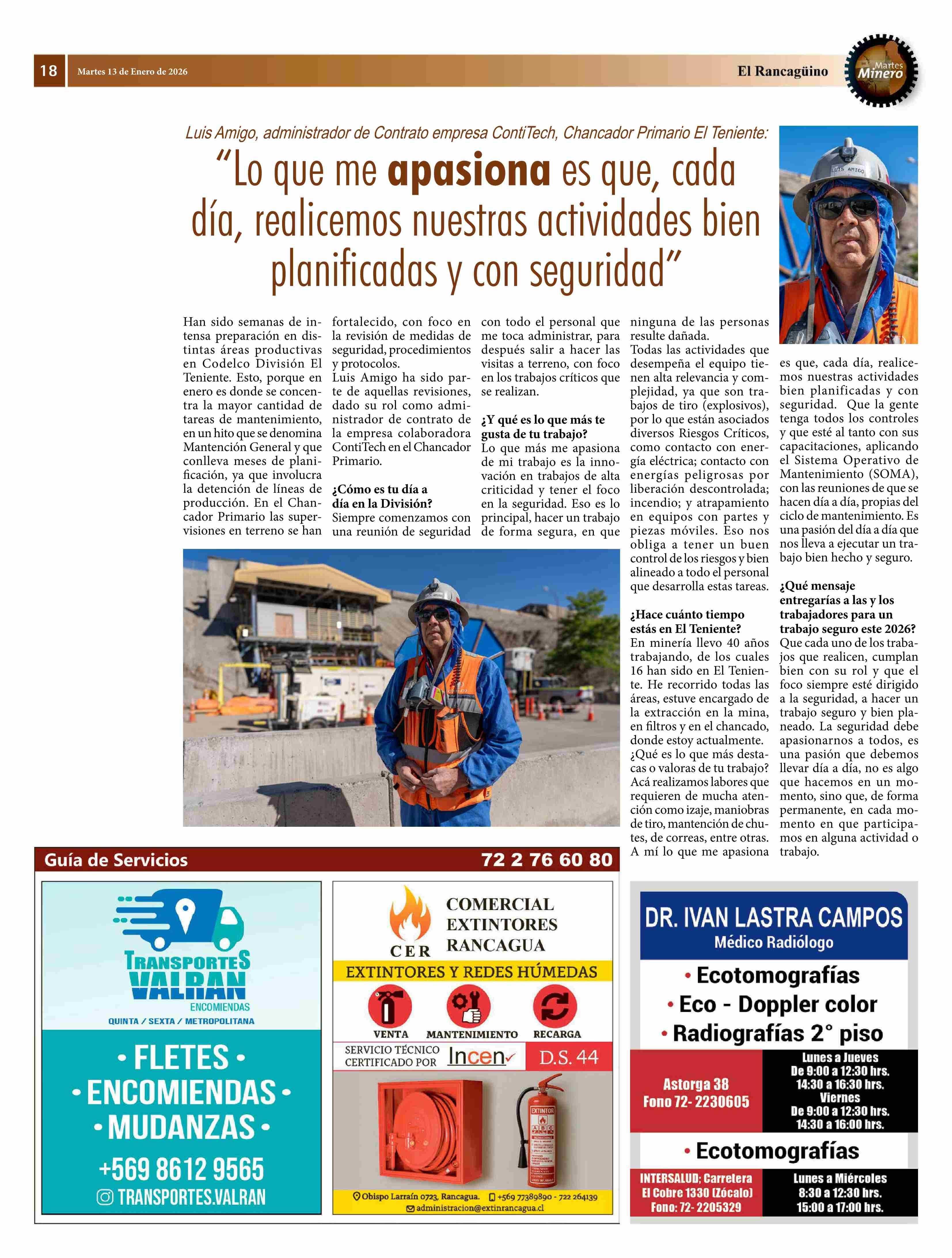 "Lo que me apasiona es que, cada día, realicemos nuestras actividades bien planificadas y con seguridad" 13-01-2026 El Rancagüino |