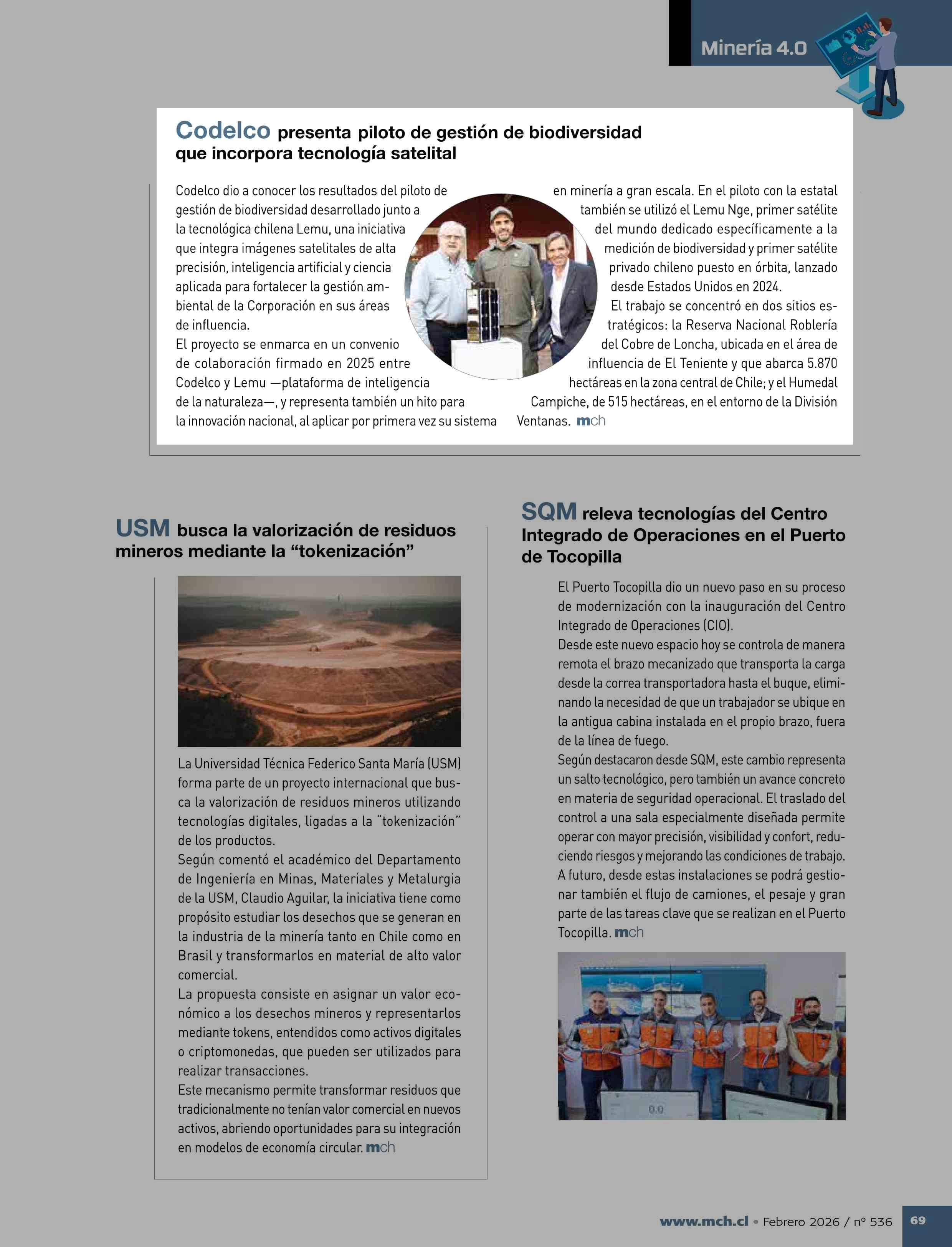 Codelco presenta piloto de gestión de biodiversidad que incorpora tecnología satelital 19-02-2026 Revista Minería Chilena |
