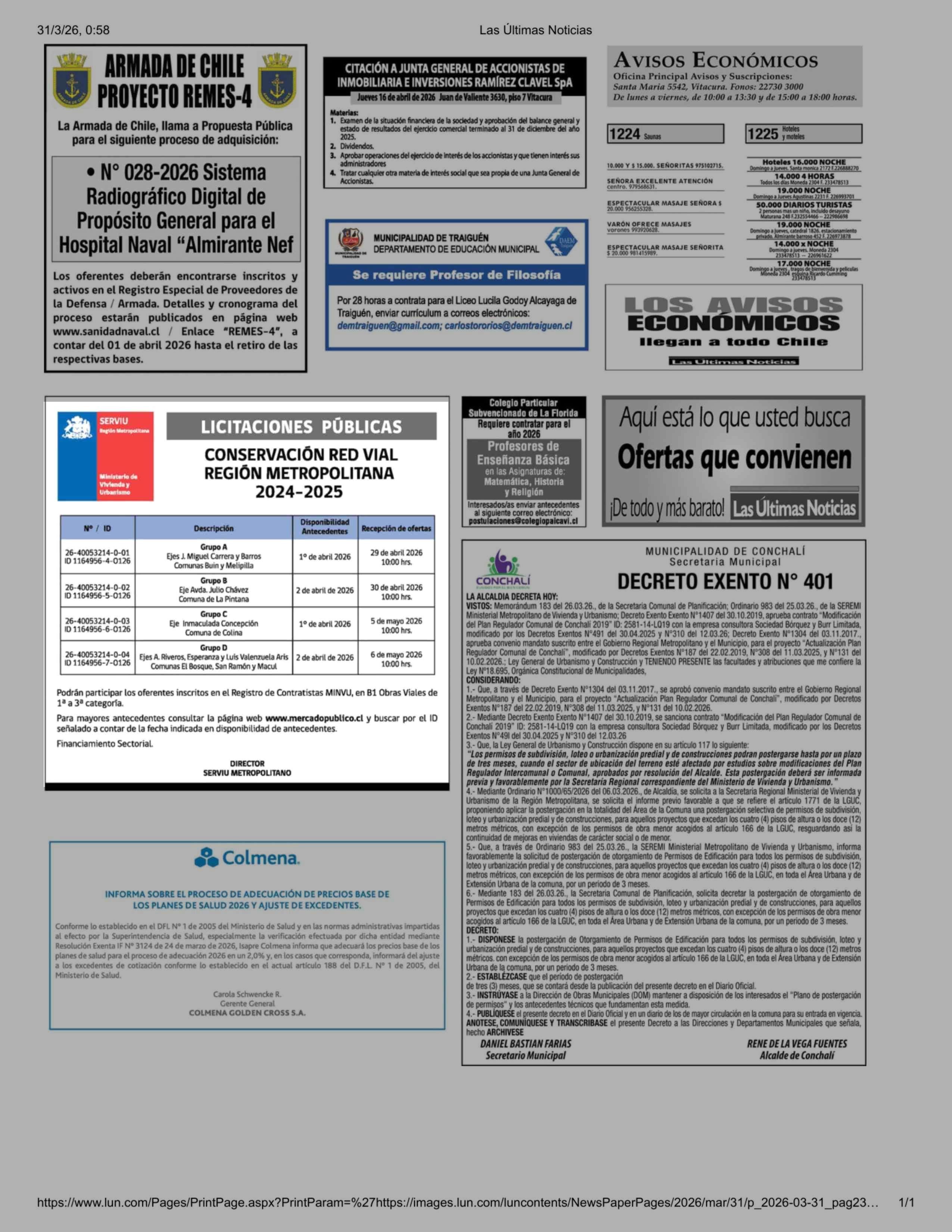 Aviso Licitaciones: LICITACIONES PÚBLICAS CONSERVACIÓN RED VIAL REGION METROPOLITANA 2024-2025 31-03-2026 Las Últimas Noticias |