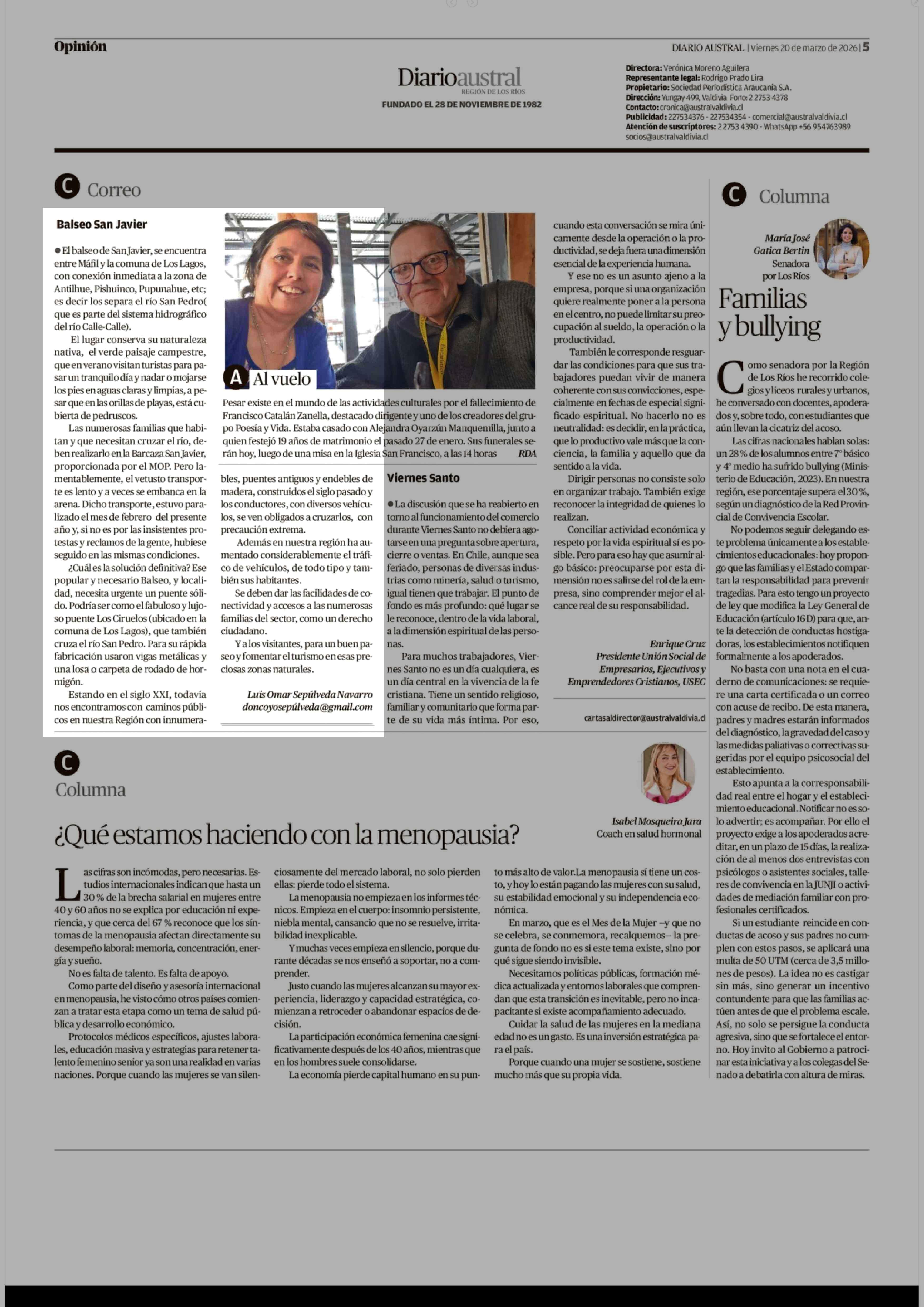 Cartas: Balseo San Javier 20-03-2026 Diario Austral Región de Los Ríos |