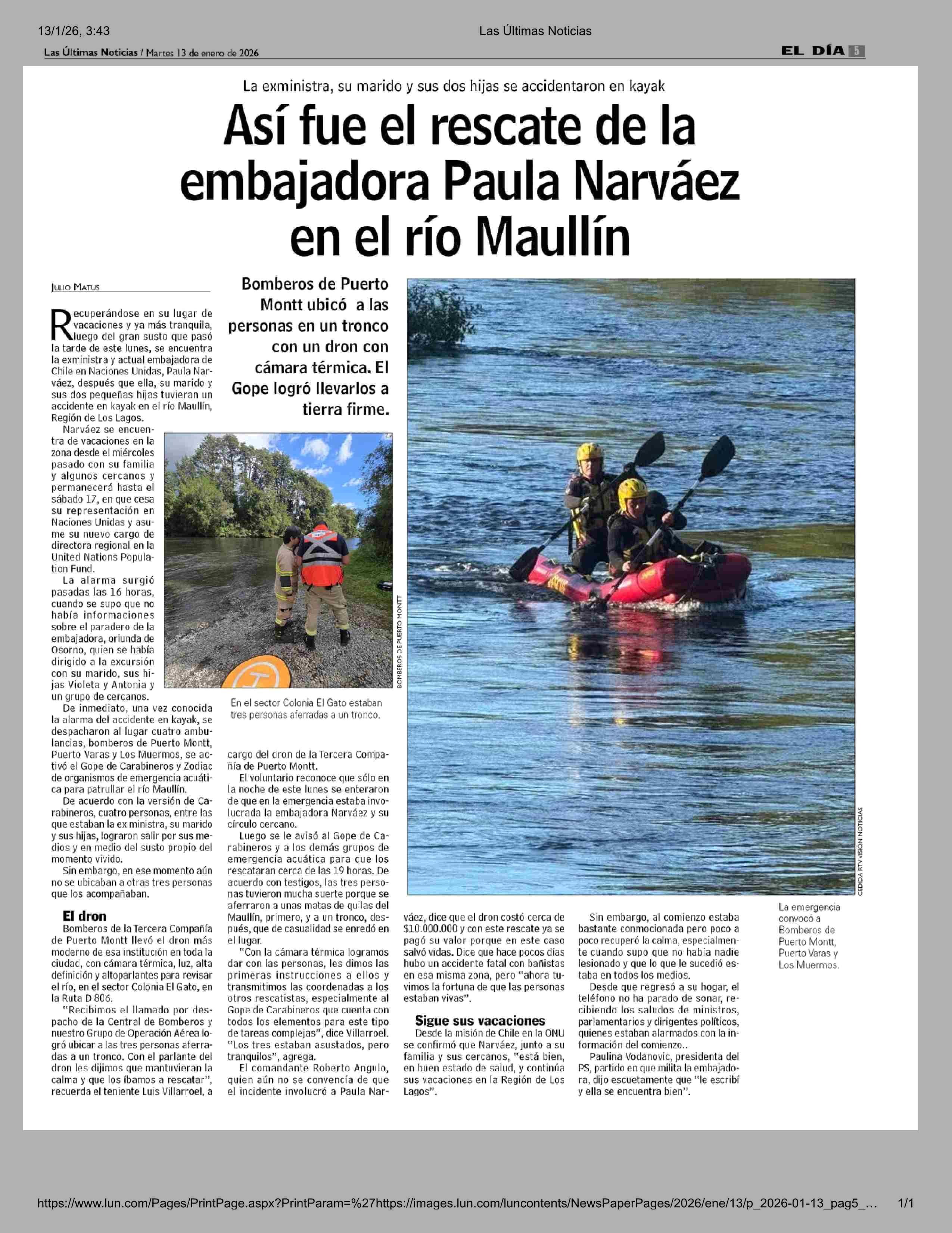 Así fue el rescate de la embajadora Paula Narváez en el río Maullín 13-01-2026 Las Últimas Noticias |