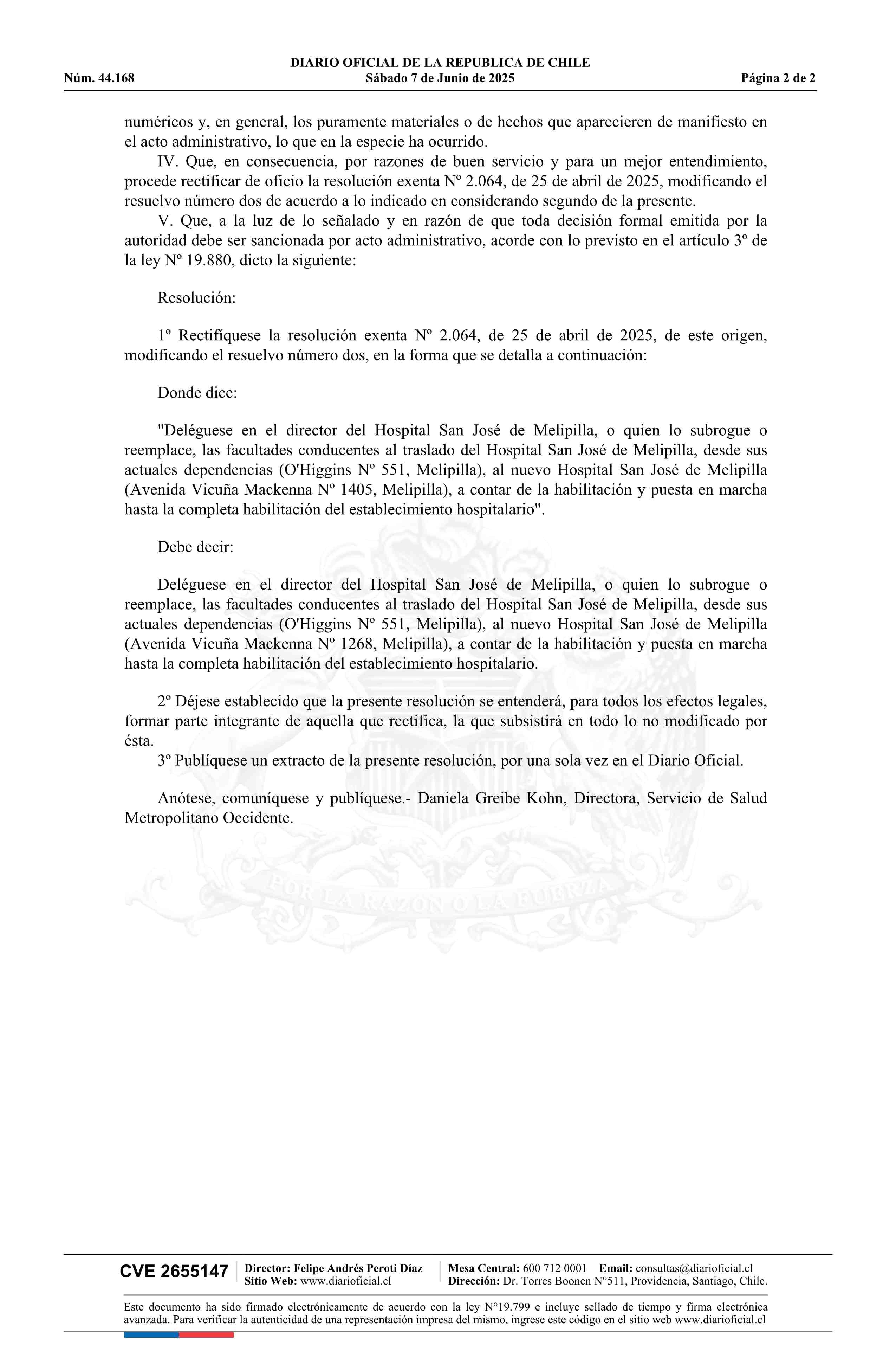 Título: Resolución exenta número 2.591, de 2025.- Rectifica resolución Nº 2.064 exenta, 2025, que delega facultades que indica, en Director de Hospital San José de Melipilla