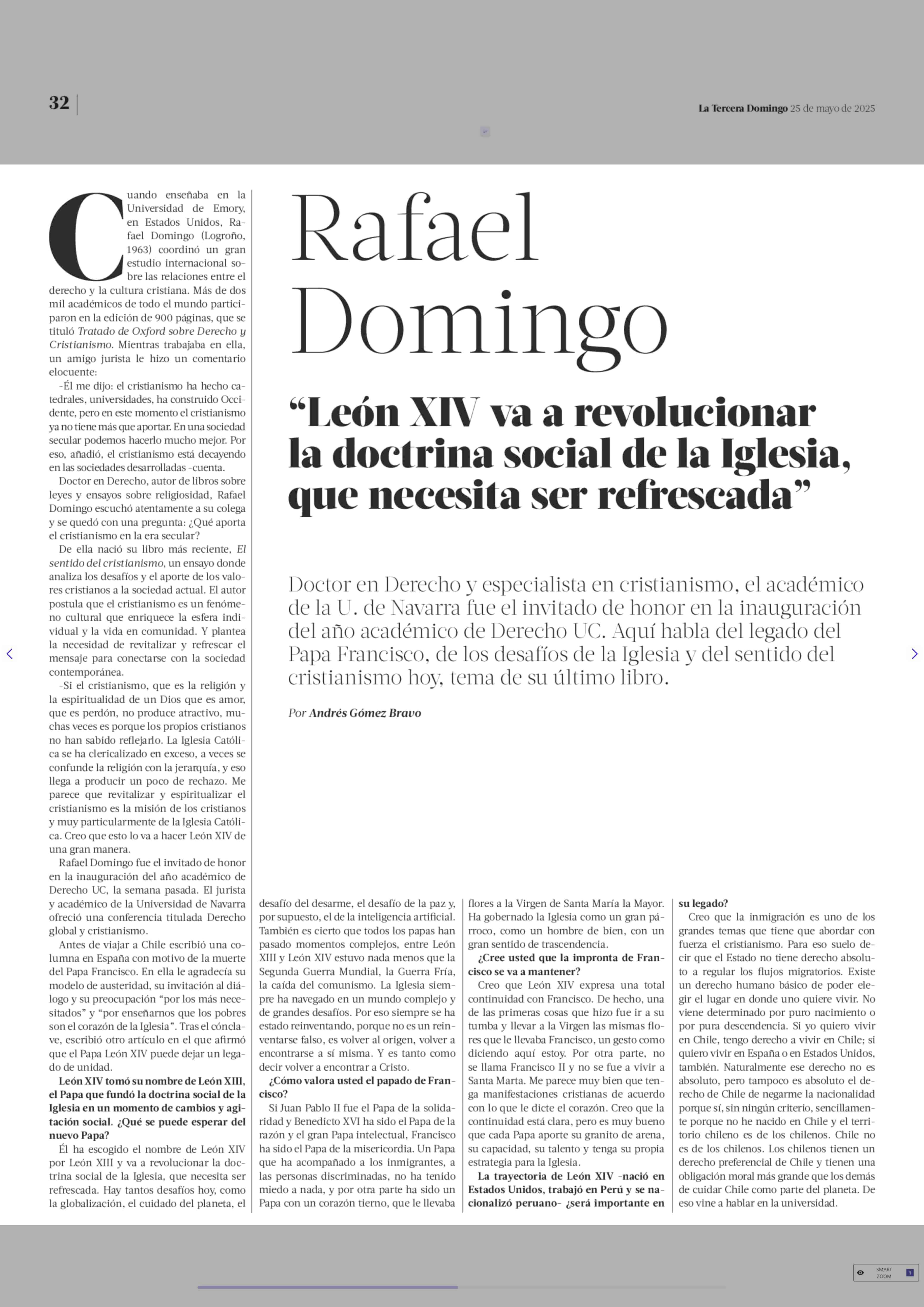 Ralael Domingo “León XIV va a revolucionar la doctrina social de la Iglesia, que necesita ser refrescada” 25-05-2025 La Tercera |