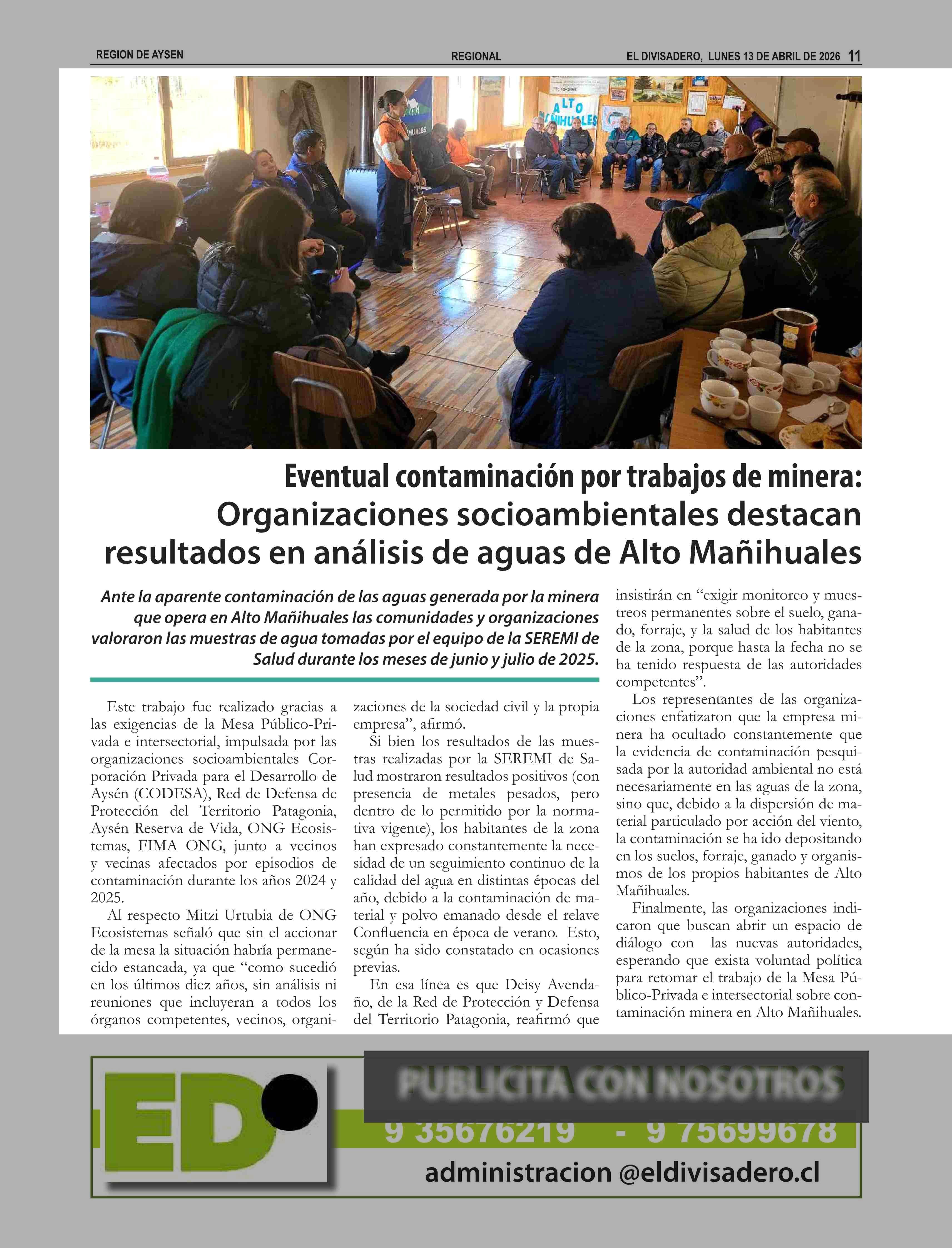 Título: Eventual contaminación por trabajos de minera: Organizaciones socioambientales destacan resultados en análisis de aguas de Alto Mañihuales