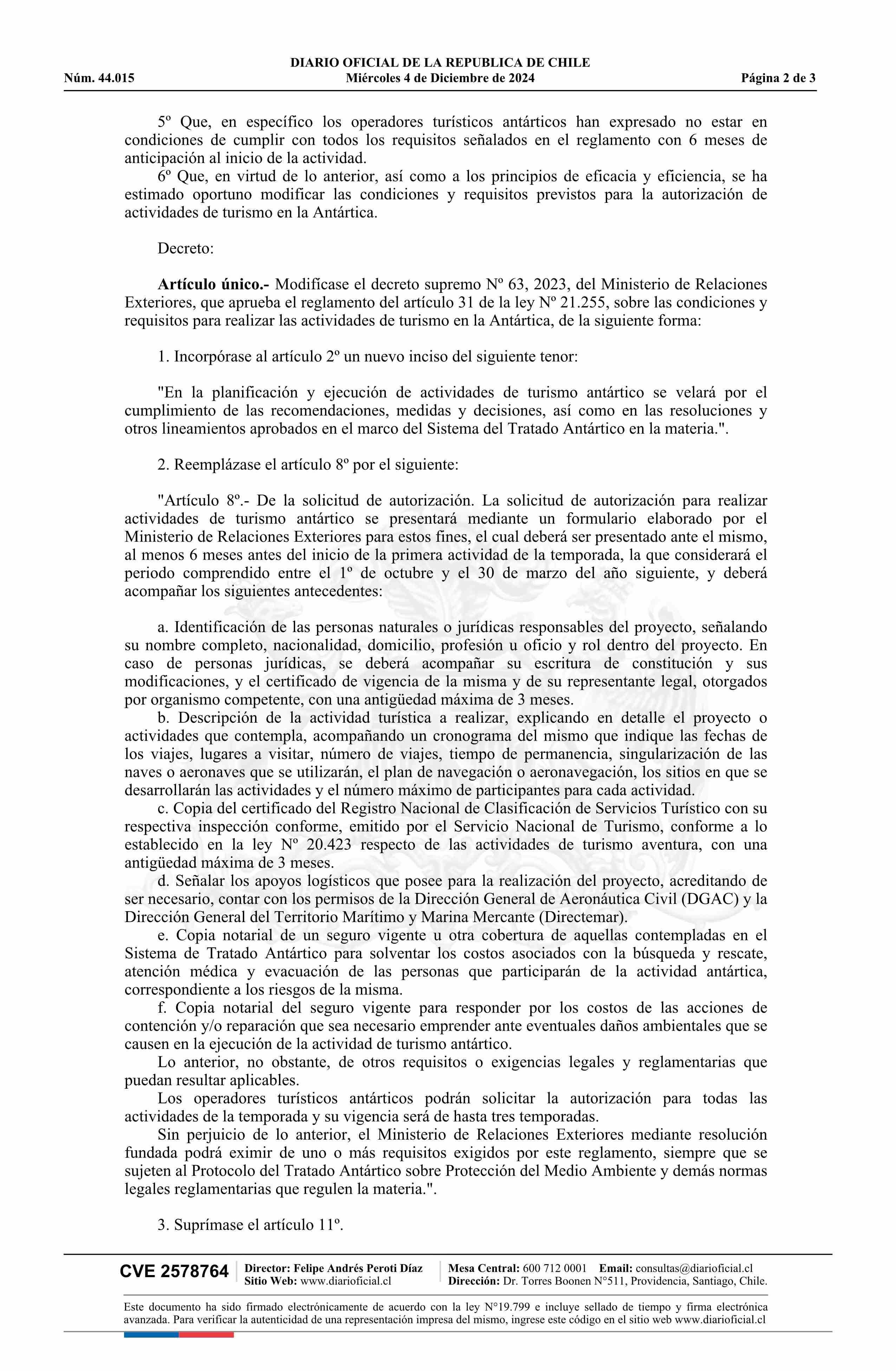 Decreto número 106, de 2024.- Modifica el decreto Nº 63, de 2023, que aprueba reglamento del artículo 31 de la Ley Nº 21.255, sobre las condiciones y requisitos para realizar las actividades de turismo en la Antártica 04-12-2024 DIARIO OFICIAL CHILE - BOLETÍN OFICIAL DE MINERÍA |