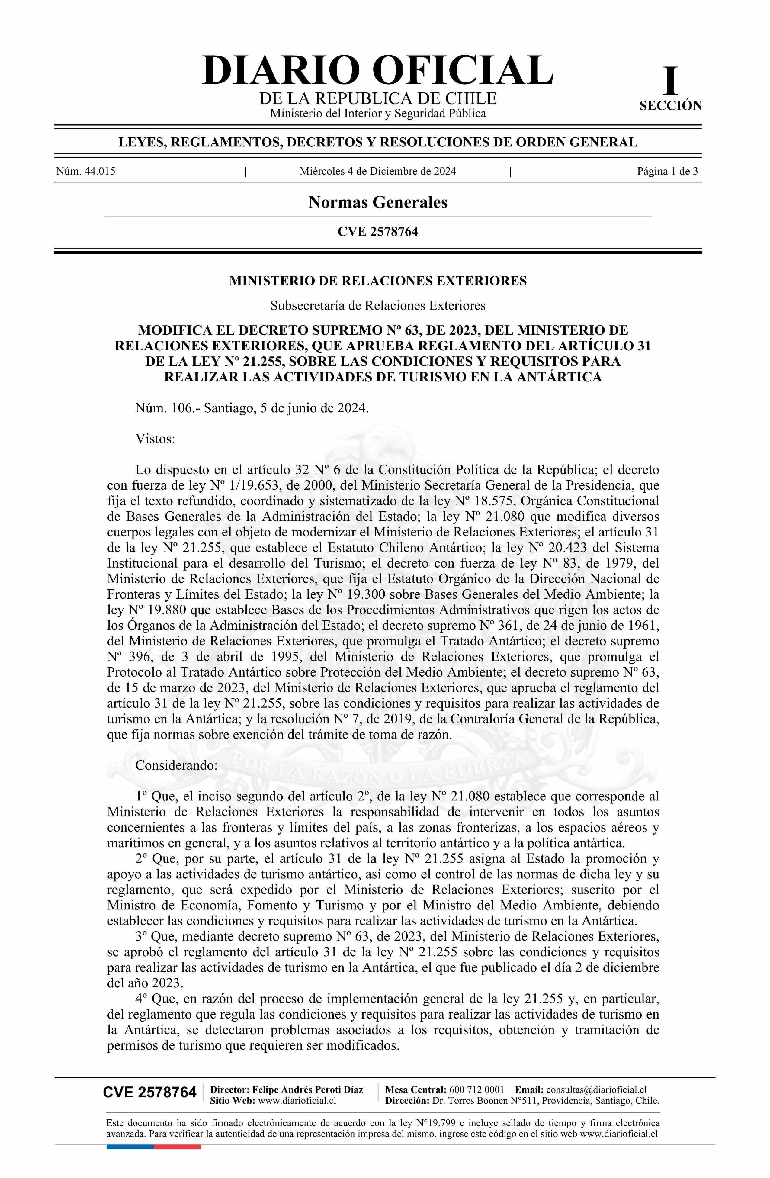| Título: | Decreto número 106, de 2024.- Modifica el decreto Nº 63, de 2023, que aprueba reglamento del artículo 31 de la Ley Nº 21.255, sobre las condiciones y requisitos para realizar las actividades de turismo en la Antártica |