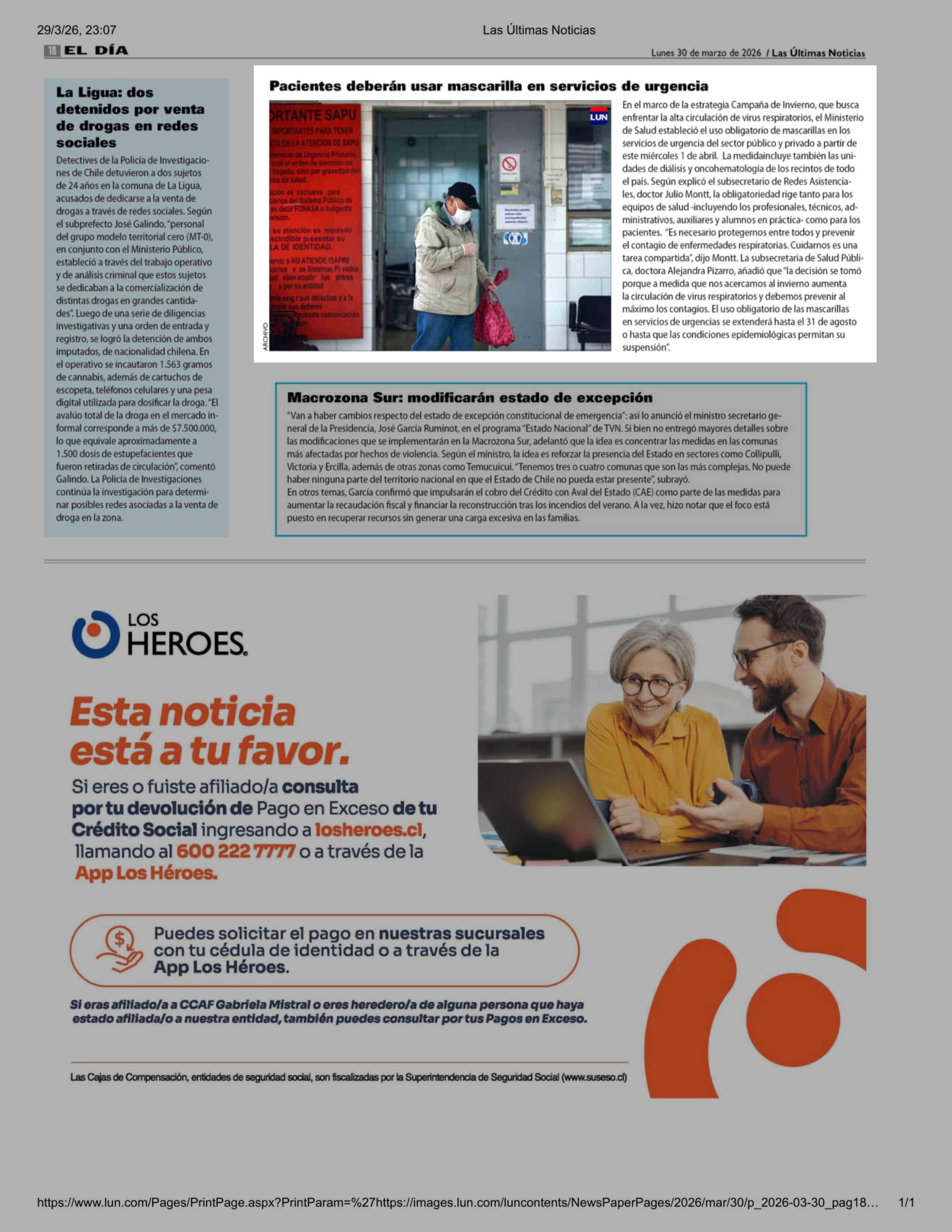 Pacientes deberán usar mascarilla en servicios de urgencia 30-03-2026 Las Últimas Noticias |