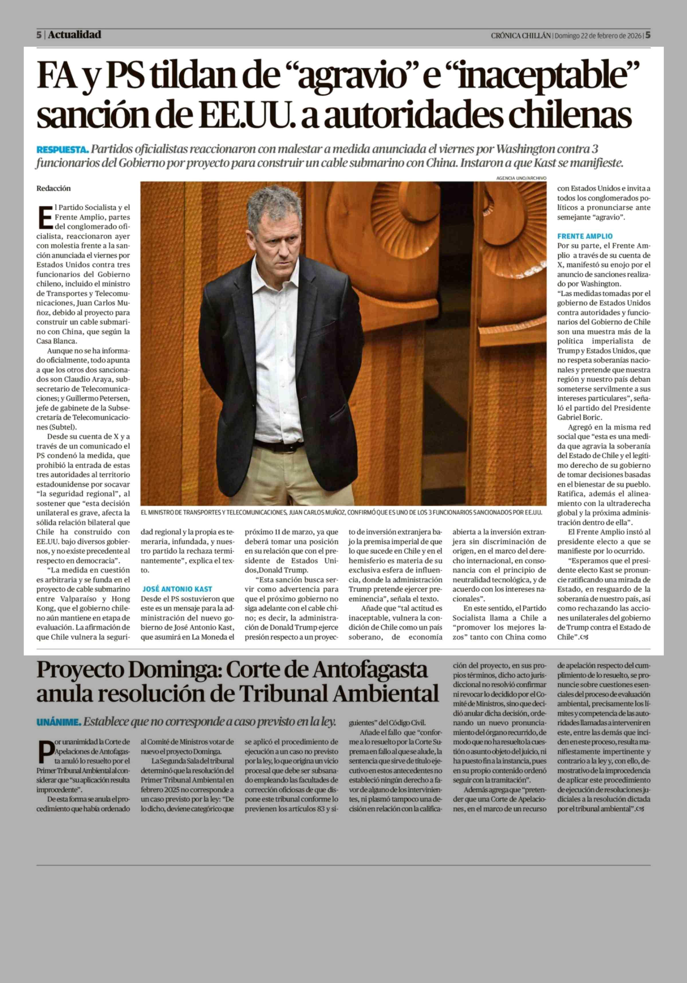 FA y PS tildan de "agravio" e "inaceptable" sanción de EE.UU. a autoridades chilenas 22-02-2026 Crónica de Chillán |