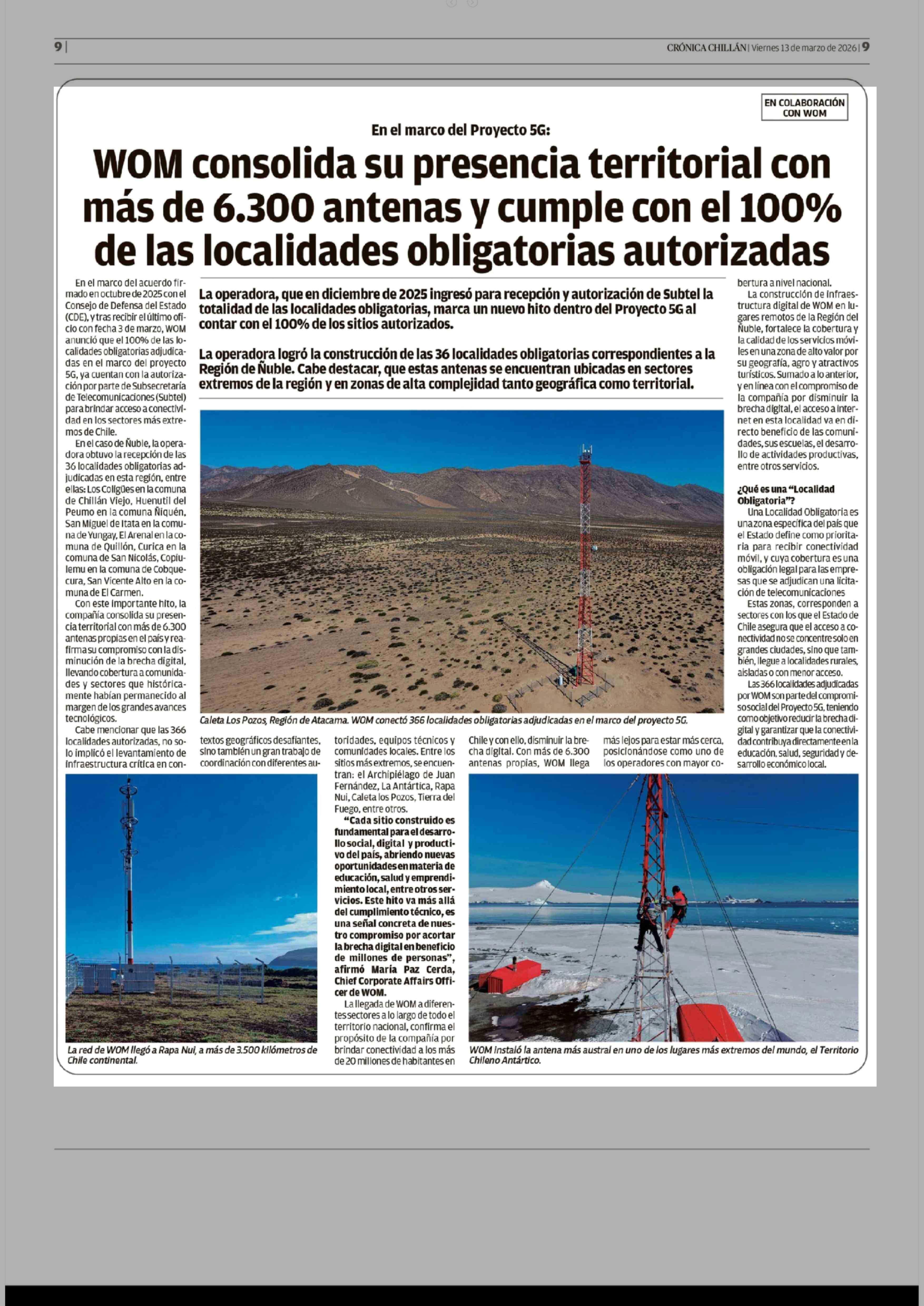 WOM consolida su presencia territorial con más de 6.300 antenas y cumple con el 100% de las localidades obligatorias autorizadas 13-03-2026 Crónica de Chillán |