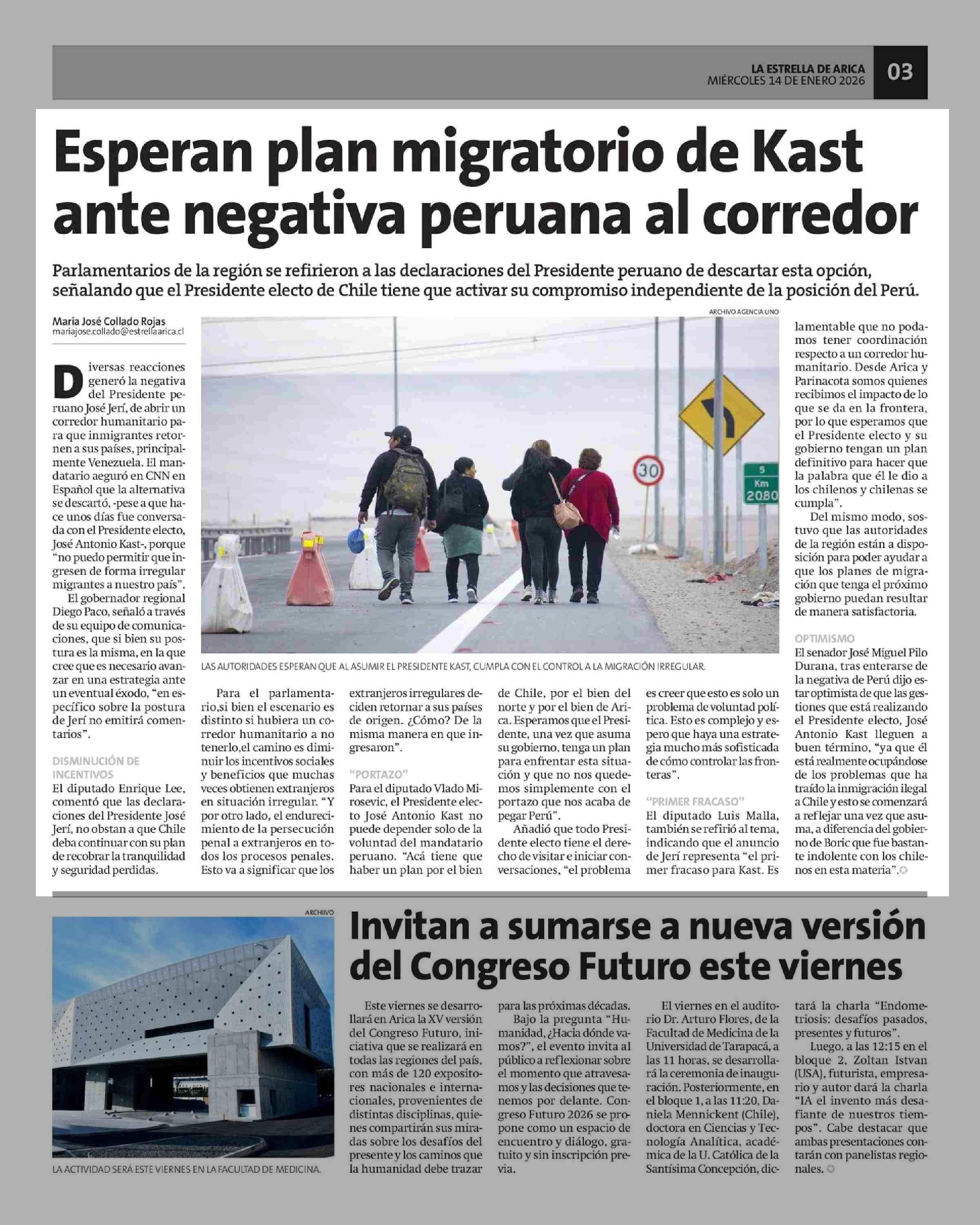 Esperan plan migratorio de Kast ante negativa peruana al corredor 14-01-2026 La Estrella de Arica |