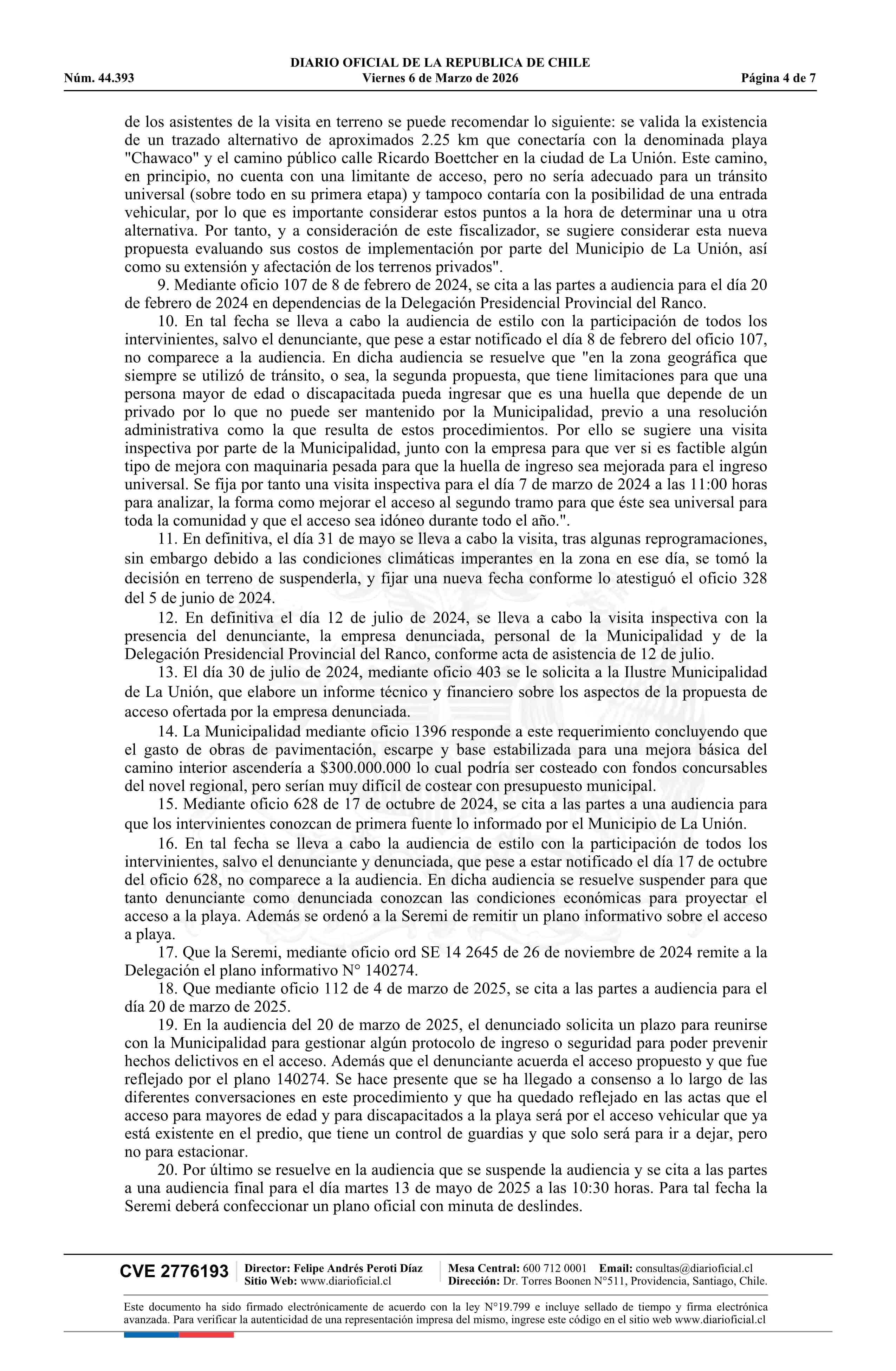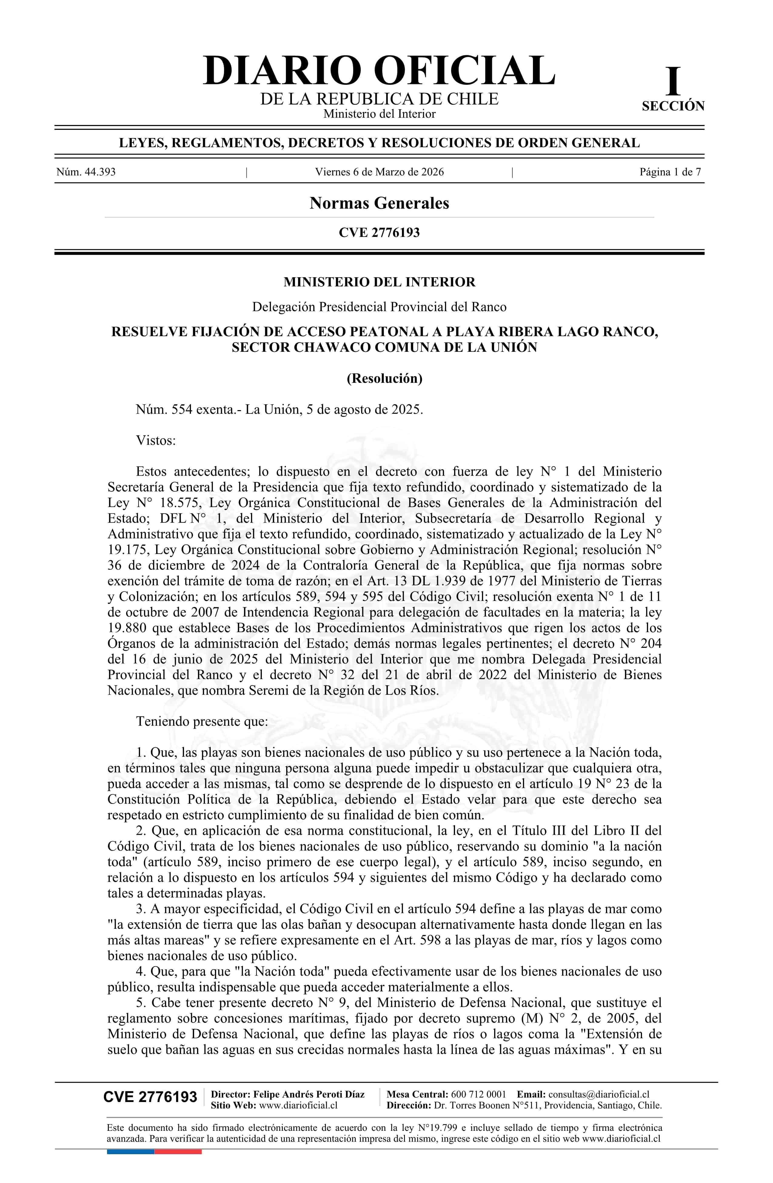 Resolución exenta número 554, de 2025.- Resuelve fijación de acceso peatonal a playa ribera Lago Ranco, sector Chawaco, en la comuna de La Unión 06-03-2026 Diario Oficial Edición Electrónica |
