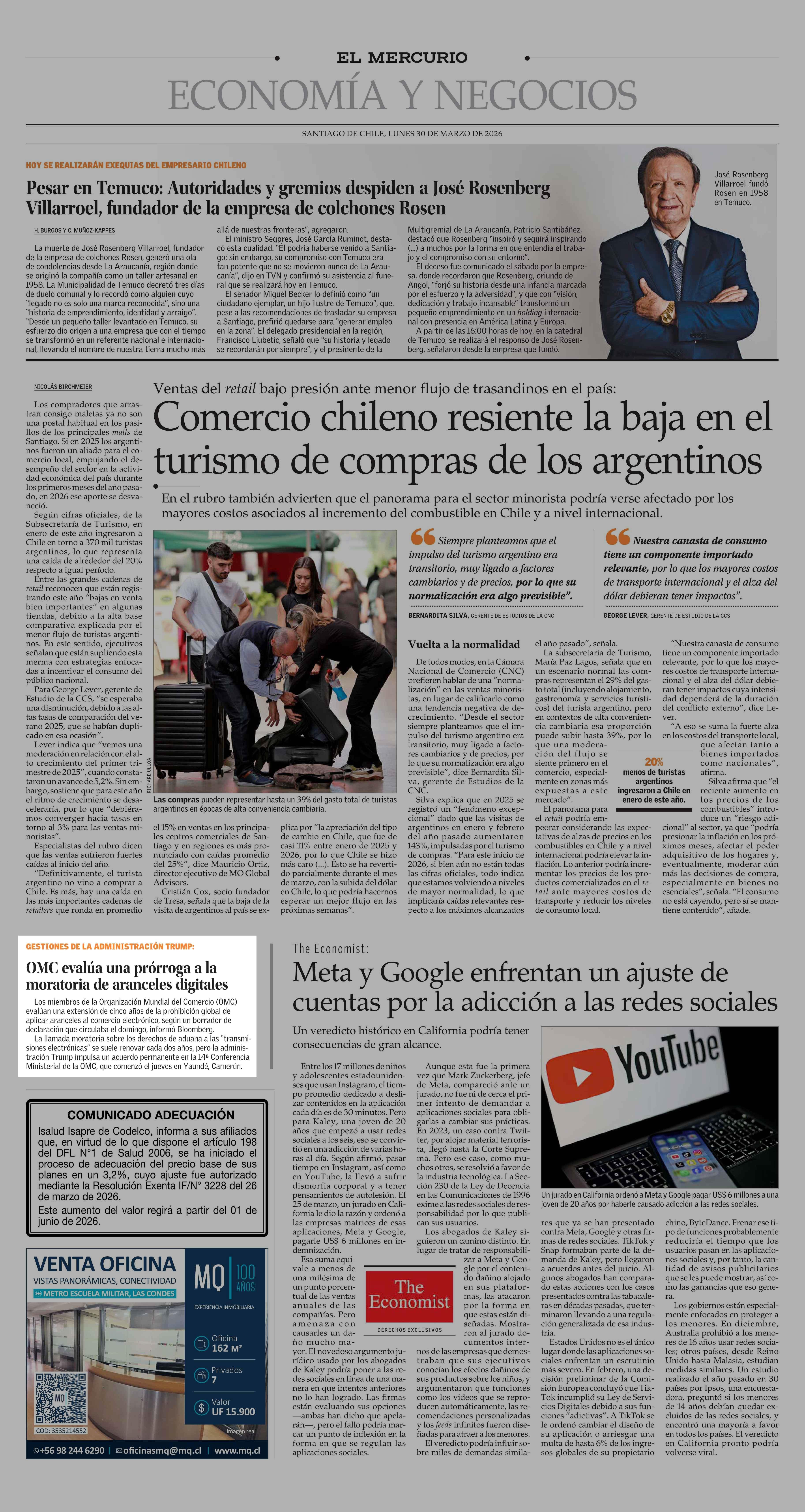 OMC evalúa una prórroga a la moratoria de aranceles digitales 30-03-2026 El Mercurio |