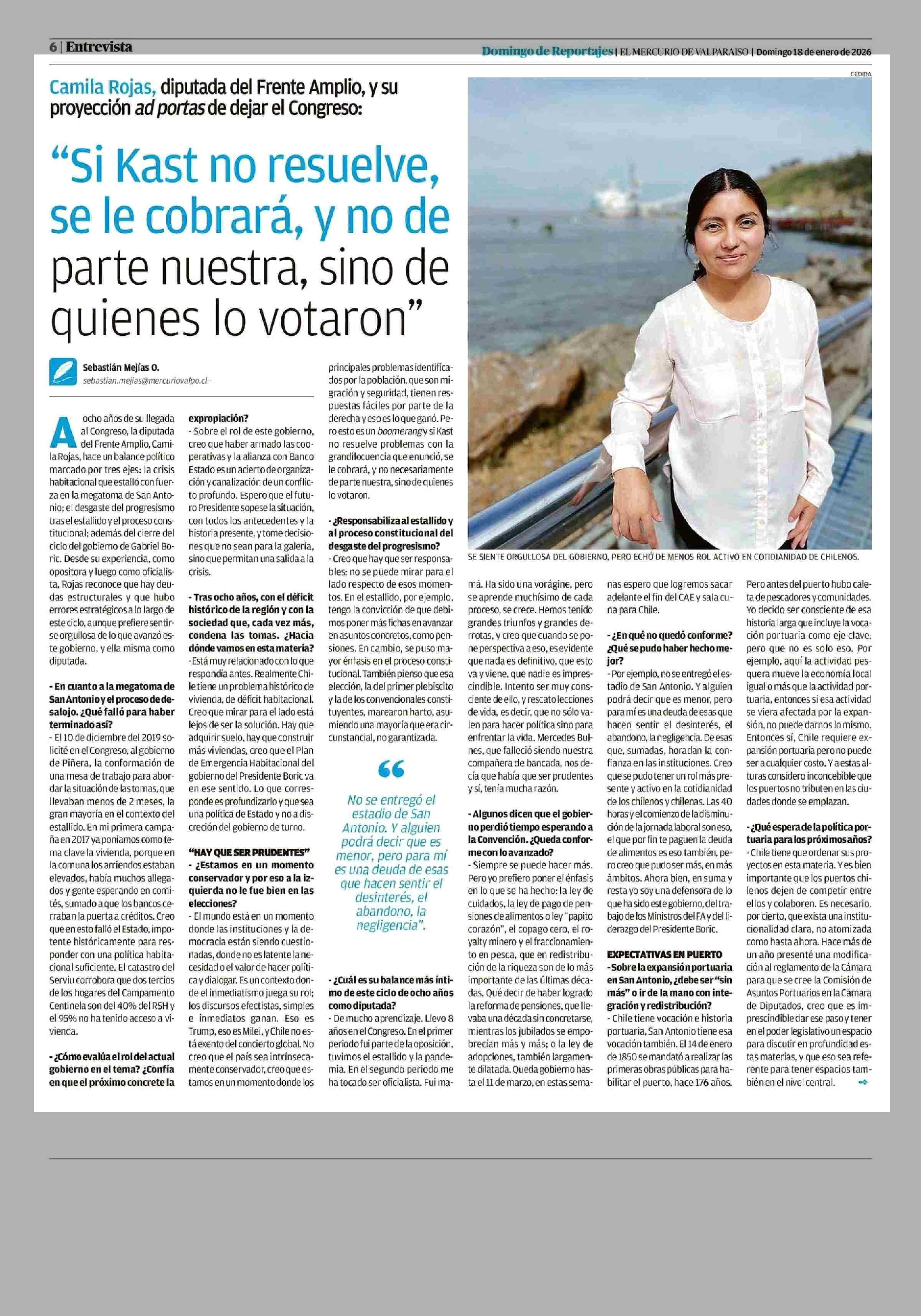 "Si Kast no resuelve, se le cobrará, y no de parte nuestra, sino de quienes lo votaron" 18-01-2026 El Mercurio de Valparaíso |