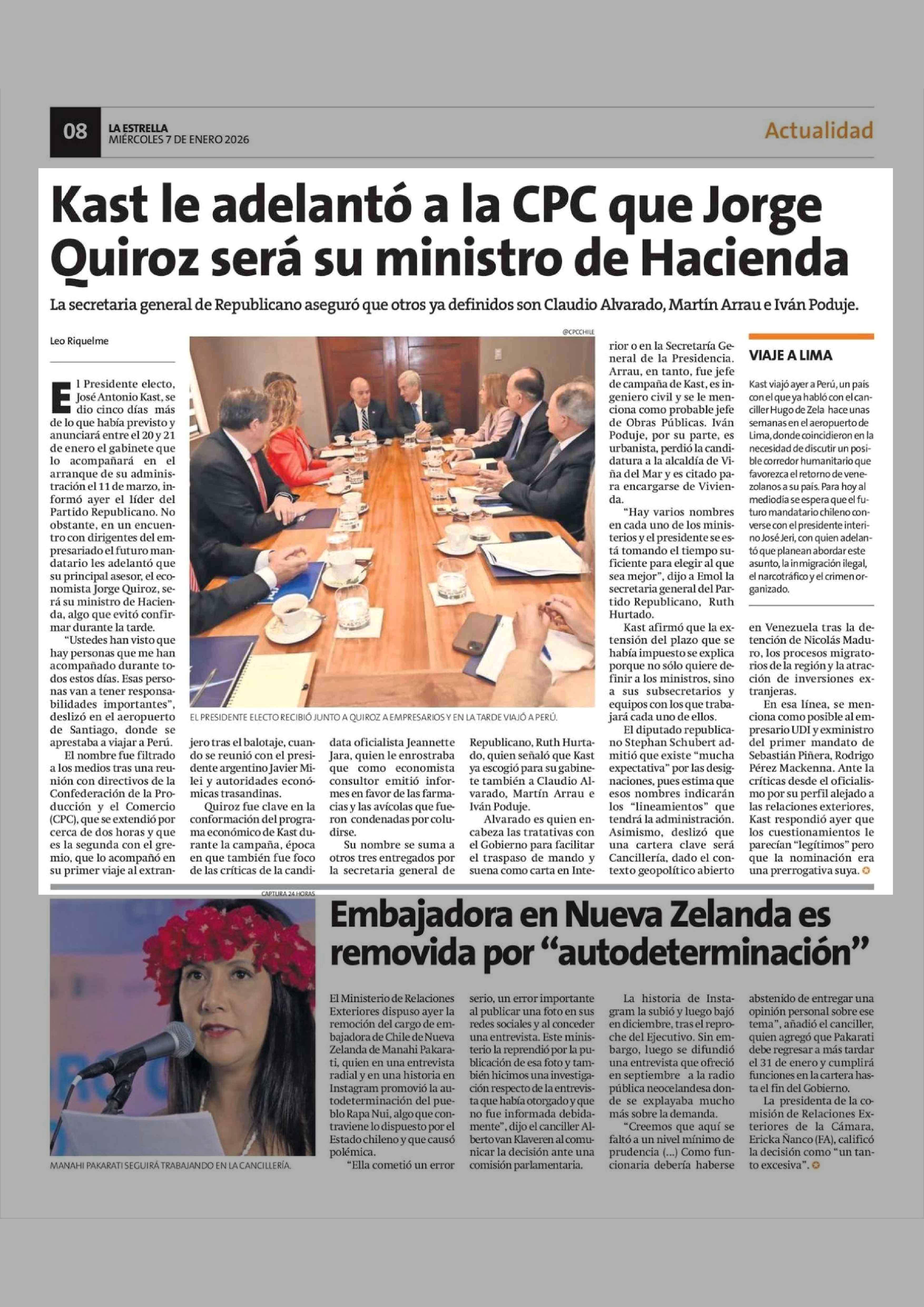 Kast le adelantó a la CPC que Jorge Quiroz será su ministro de Hacienda 07-01-2026 La Estrella de Concepción |
