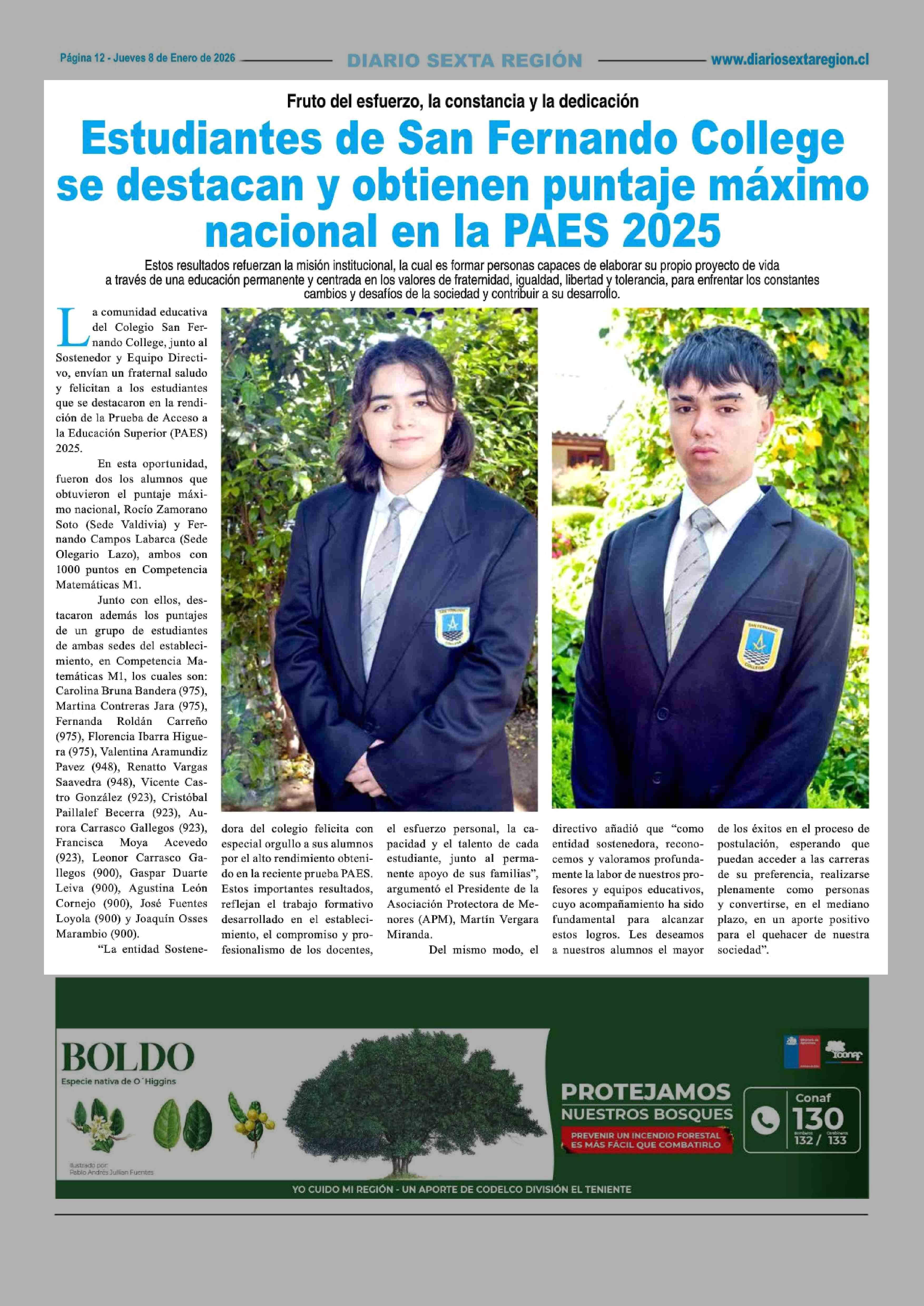 Estudiantes de San Fernando College se destacan y obtienen puntaje máximo nacional en la PAES 2025 08-01-2026 Diario VI Región |
