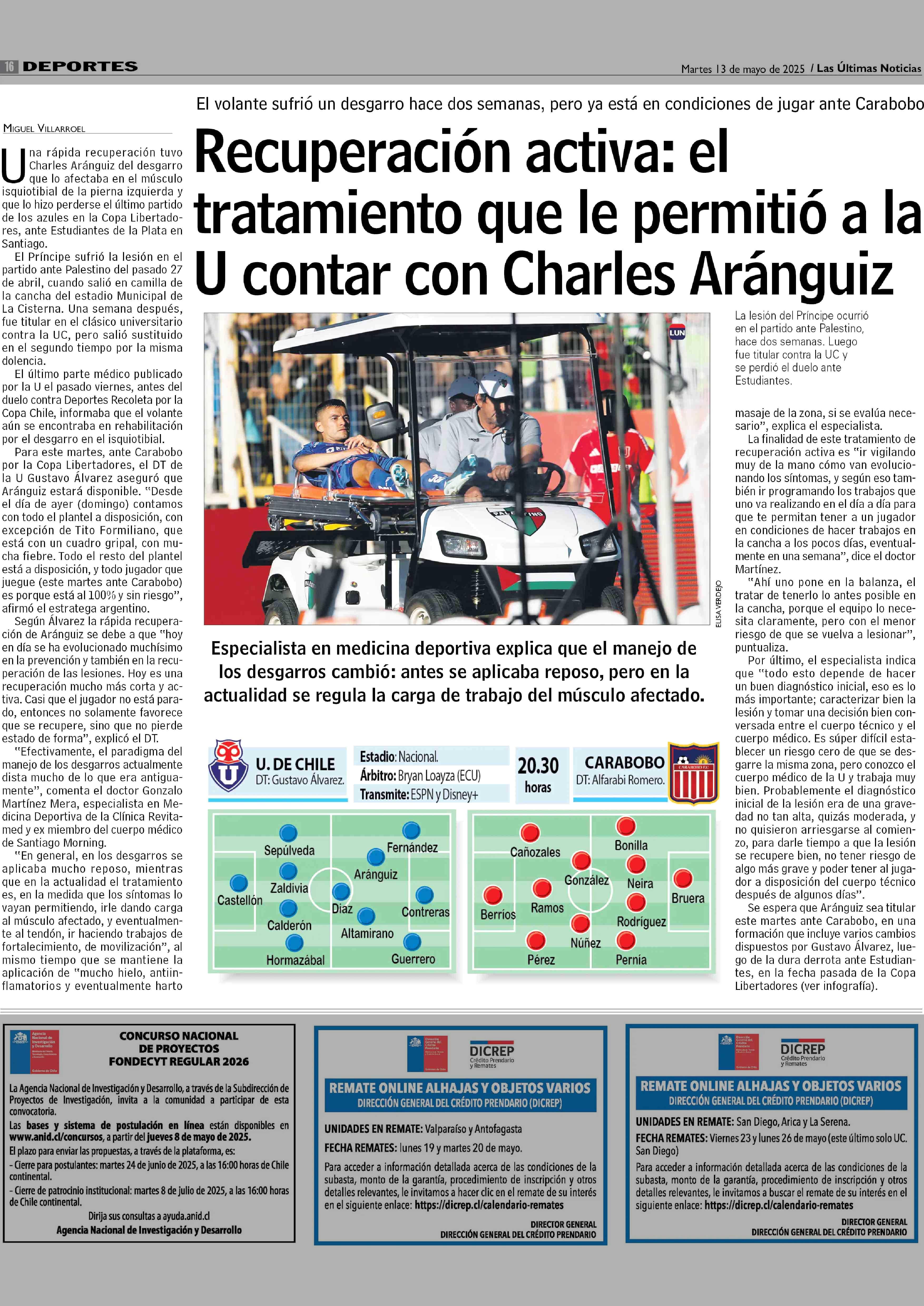 Recuperación activa: el tratamiento que le permitió a la U contar con Charles Aránquiz 13-05-2025 Las Últimas Noticias |