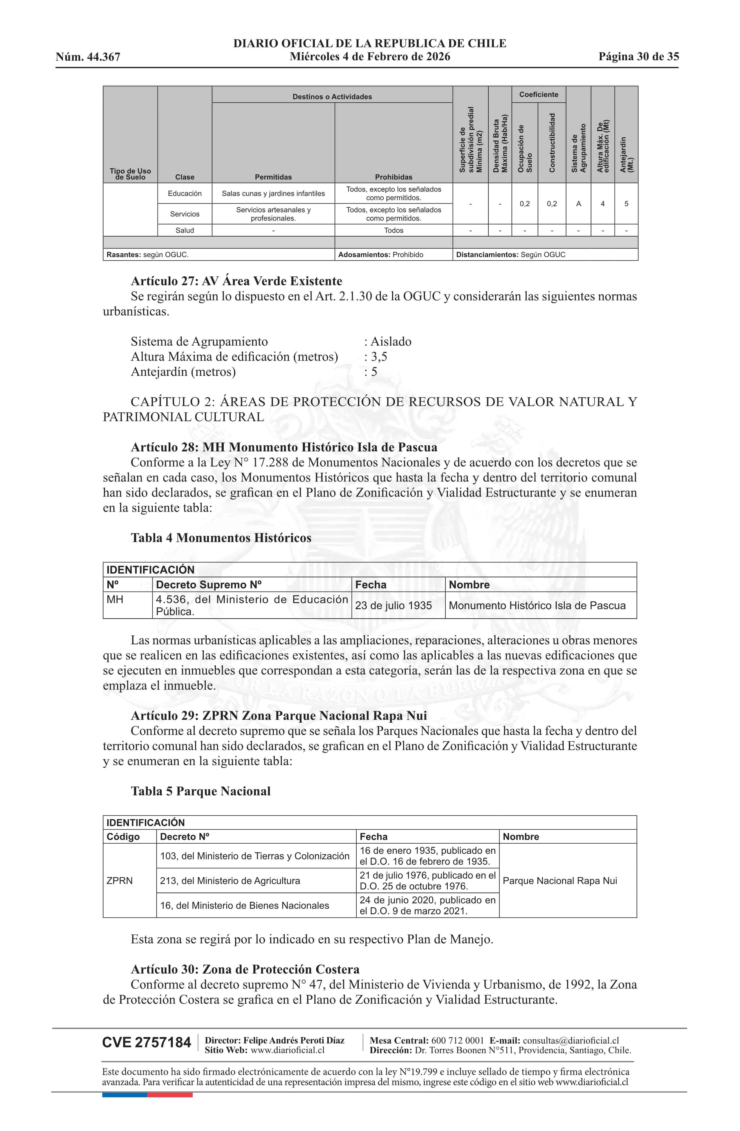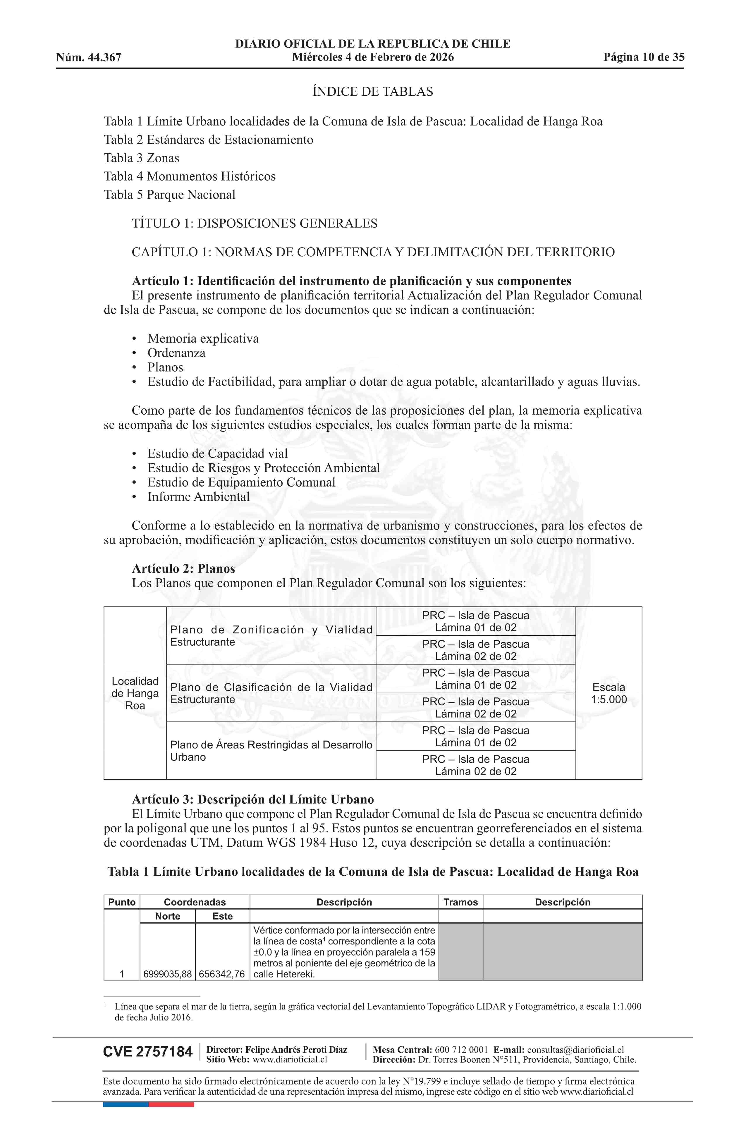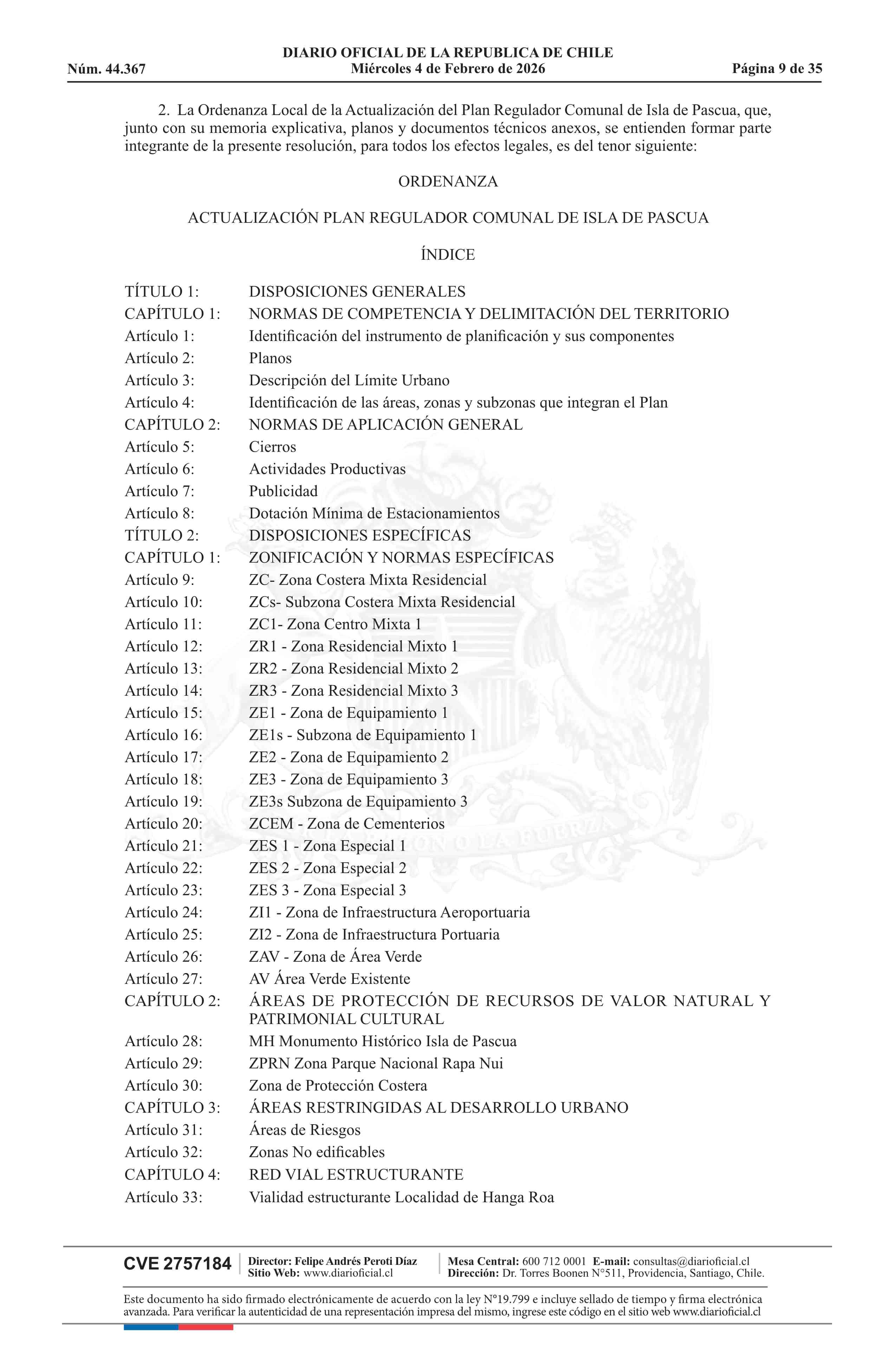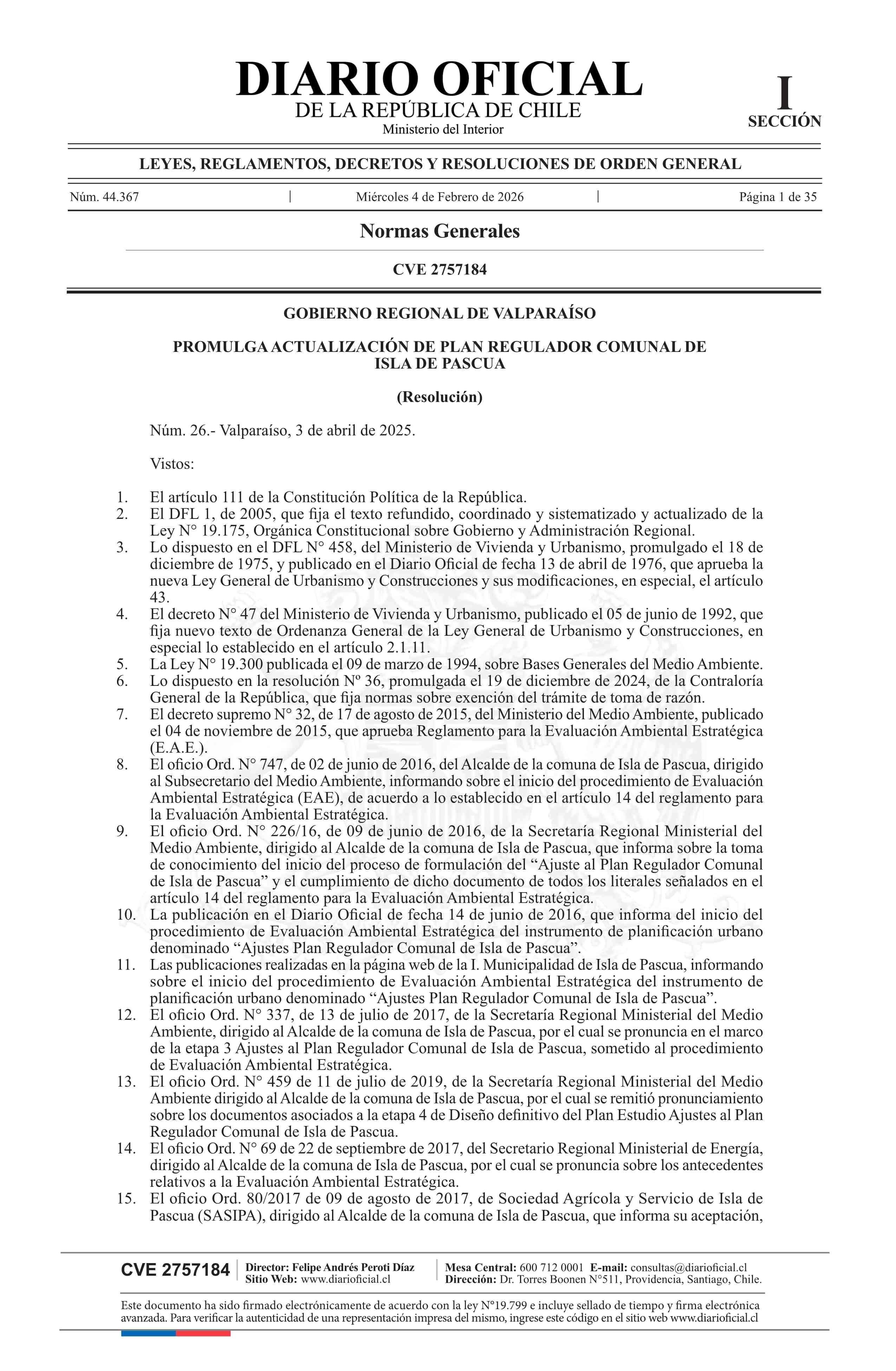 Resolución número 26, de 2025.- Promulga actualización del Plan Regulador Comunal de Isla de Pascua 04-02-2026 Diario Oficial Edición Electrónica |